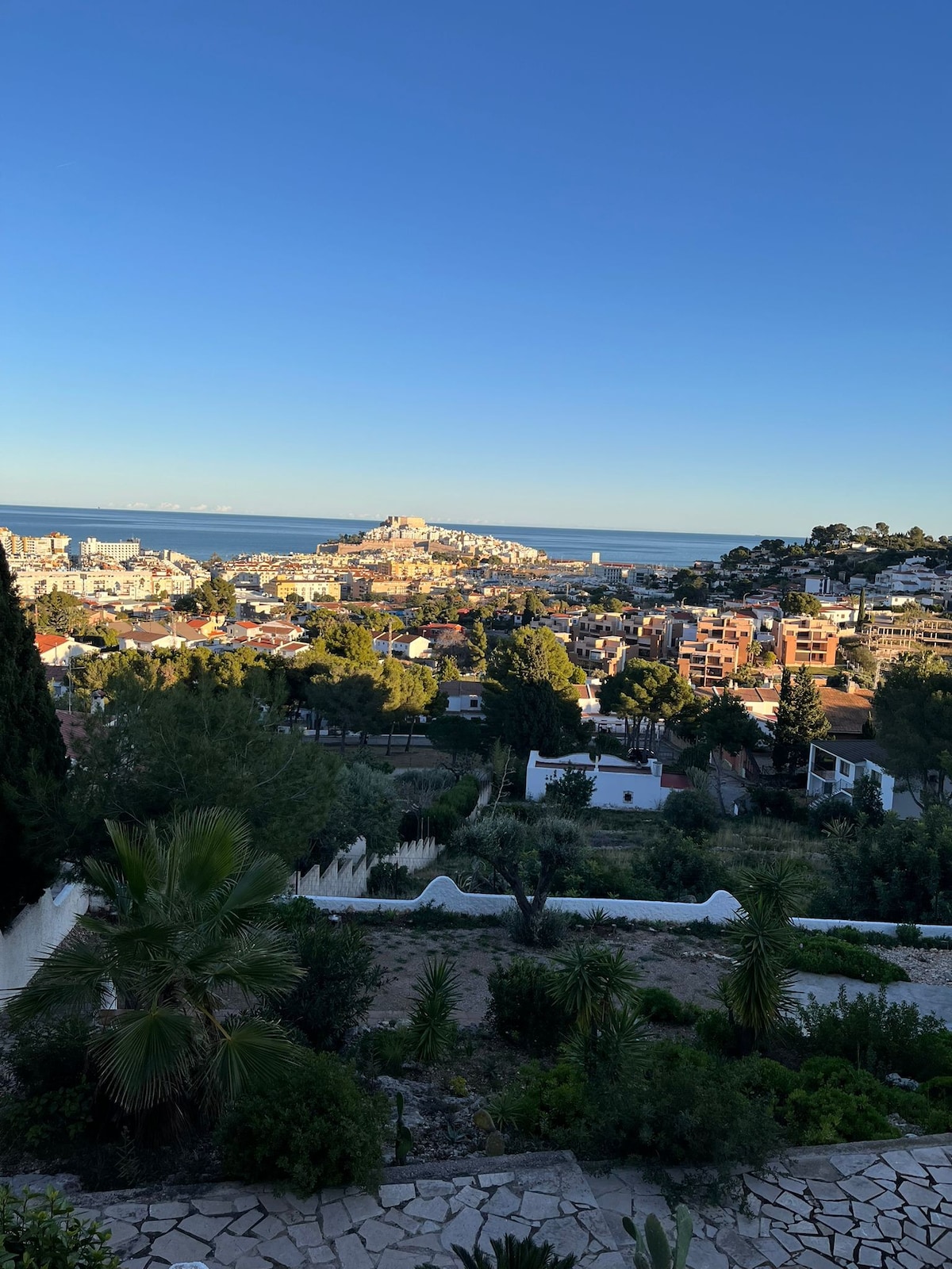 Casa en Peñíscola a 1 km de la playa. ubicado en un sitio tranquilo con vista al castillo y al mar en las atalayas de Peñíscola, casa con terraza y jardín. Doble salón con sofá cama, cocina equipada can lavavajillas y lavadora, habitacion con baño y ducha. arriba 2 habitaciones más con bañera y aseo. Terrazas. Parking.