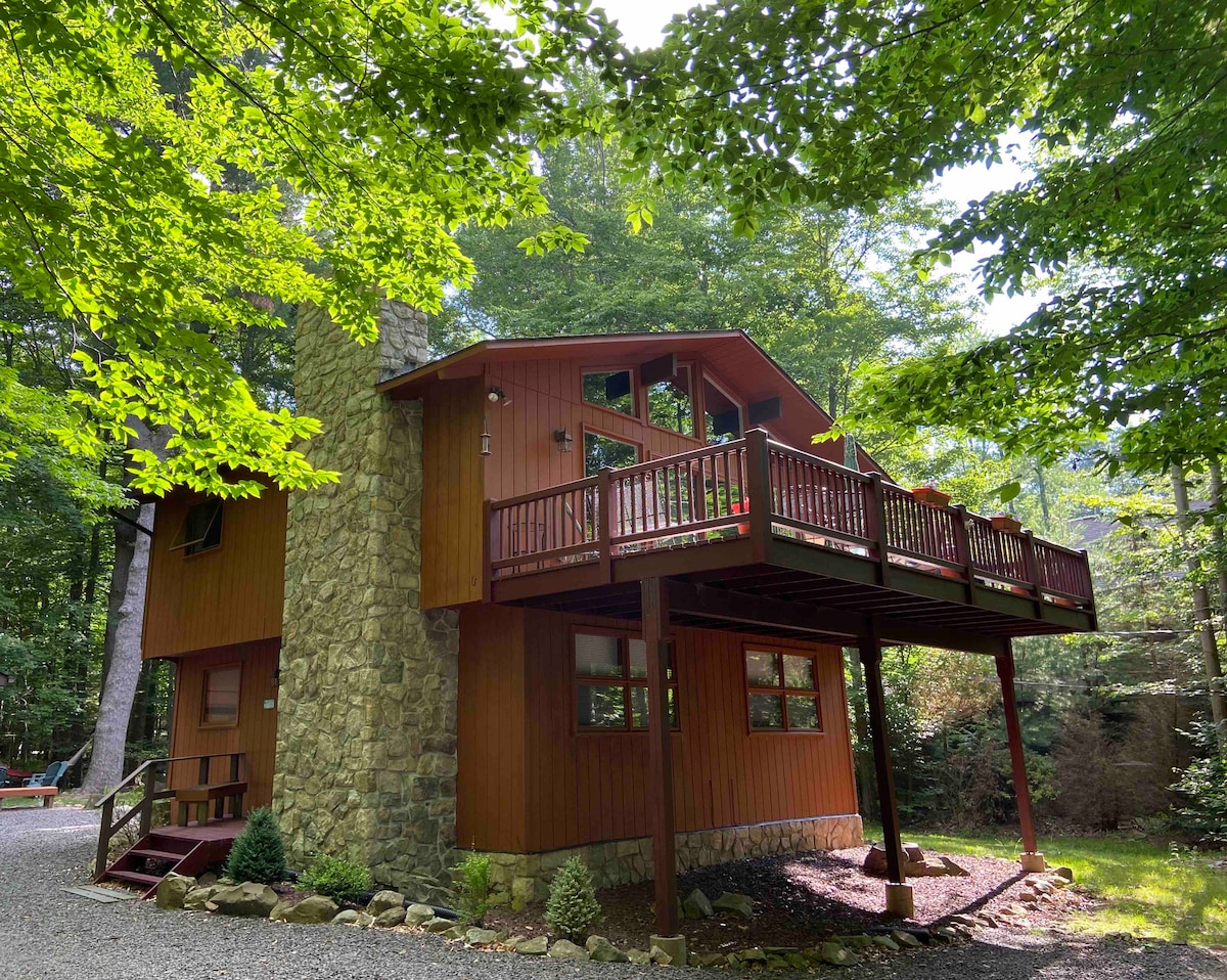 Nestled among trees and boulders, this chalet-style home offers serene, natural beauty and comfort during your stay in the Poconos. An all-season destination, guests can enjoy close proximity to ski slopes in winter, hiking in the spring, boating in the summer, and vibrant fall foliage. The house boasts large windows and a cozy living room with a large stone fireplace. Large bedrooms, plus a den easily accommodate a crowd.