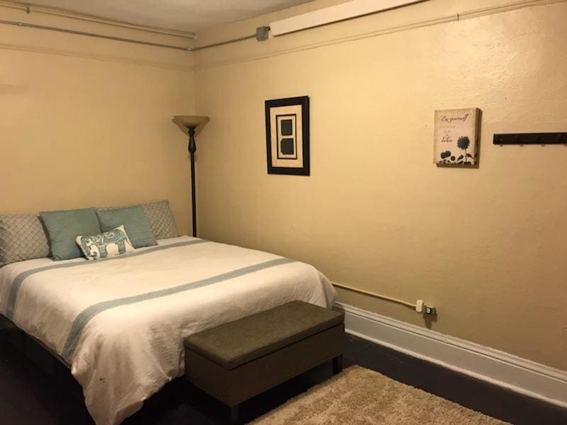 This cozy queen bedroom on the second floor has pine furniture, warm tones, and large windows with plenty of natural light. Located on the east side of the house, the bedroom overlooks a rustic barn and has neighborhood views. You can catch a glimpse of Mount Moriah Cemetery at the top of the hill. The bathroom - accessed through the hallway - is located just next door, and it's shared with one other guest room.