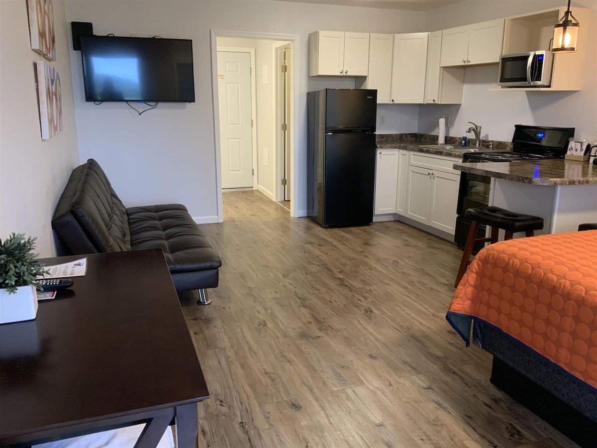 This room is dog friendly! Max weight 45 lbs, up to 2 dogs. Ground floor room with 1 king bed, fits 2 adults and 1 child. Recently renovated with new paint, flooring, bed, AC/heat, toilet, blackout shades, and furniture. Includes cable TV, Wi-Fi, mini-fridge, microwave, coffee maker, private bathroom with shower/tub, hair dryer, and toiletries. Outdoor seating available. Smoke-free. Pet fee, credit card fees, and security deposit are charged at our facility.