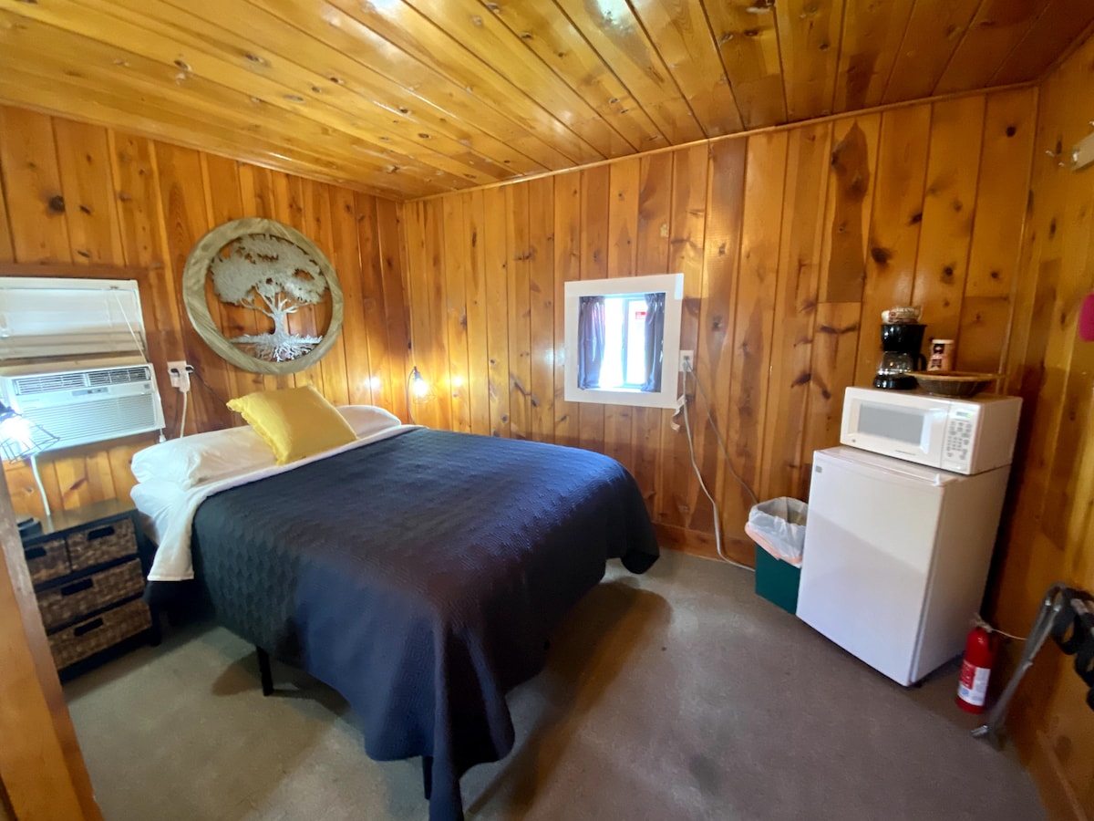 This camper cabin is located in a campground. While staying here you have access to all of the facilities which include two shower houses, a game room, a laundry room, two small playgrounds, horseshoes, and a general store that sells beer and wine. The cabin is a studio camping cabin. It has two Queen beds, a table and chairs, a microwave and a small refrigerator. There is also a propane grill on the porch. Please note that bedding is not included and the bathroom is not inside the cabin.