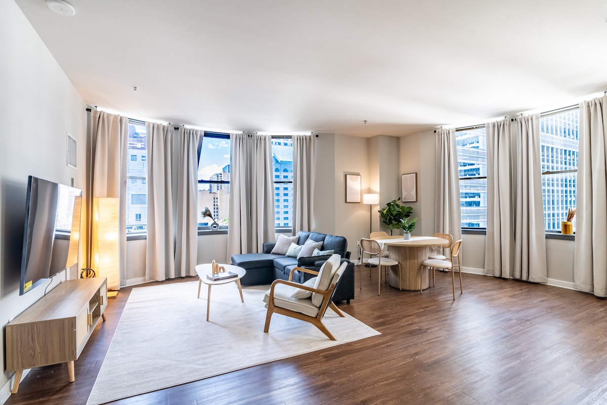A bright and calming studio with inspiring views of the Philadelphia Skyline. Featuring a cozy queen sized bed, full kitchen, large stylish bathroom, and easy elevator access. Centrally located in Center City's Loft District perfect for tourist and work travelers, minutes away from Reading Terminal Market, Independence National Historic Park, National Constitution Center, Museum of the American Revolution, Art Museum, Rail Park, only steps to Philadelphia Convention Center, and City Hall.
