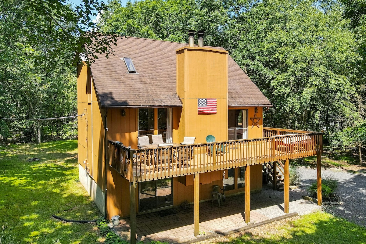 "My Lake Chalet" is in a gold-star community with plenty of amenities: access to 2 lakes, 4 beaches, playgrounds & 3 seasonal heated pools––surrounded by the beauty of Poconos’ natural wonders. The home has a relaxing six-person hot tub, sunroom & amenities that make this mountain retreat the perfect base for ski or lake activities and all the Poconos has to offer. It’s also a short walk to a lake w/ a beach and kids’ playground. Please note that community fees apply to guests 6 yo or above. (Se