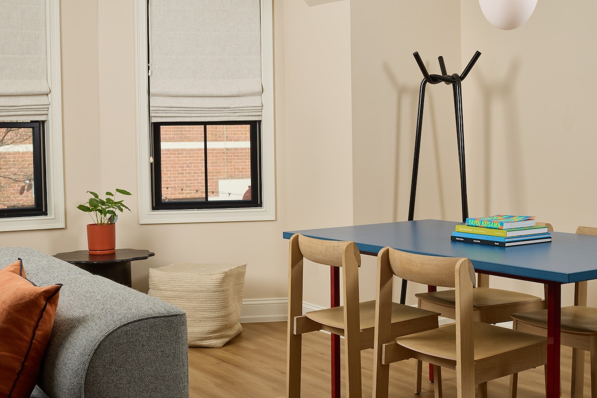Tucked in the quiet corner behind our storefront and cafe sits Suite 101. This accessible suite has our culinary kitchen that is perfect for hosting a few friends after taking in a show or day of sightseeing. Sink into the chubby accent chair by Normann Copenhagen or plan your walk through Philadelphia at the dining table over a cup of coffee.