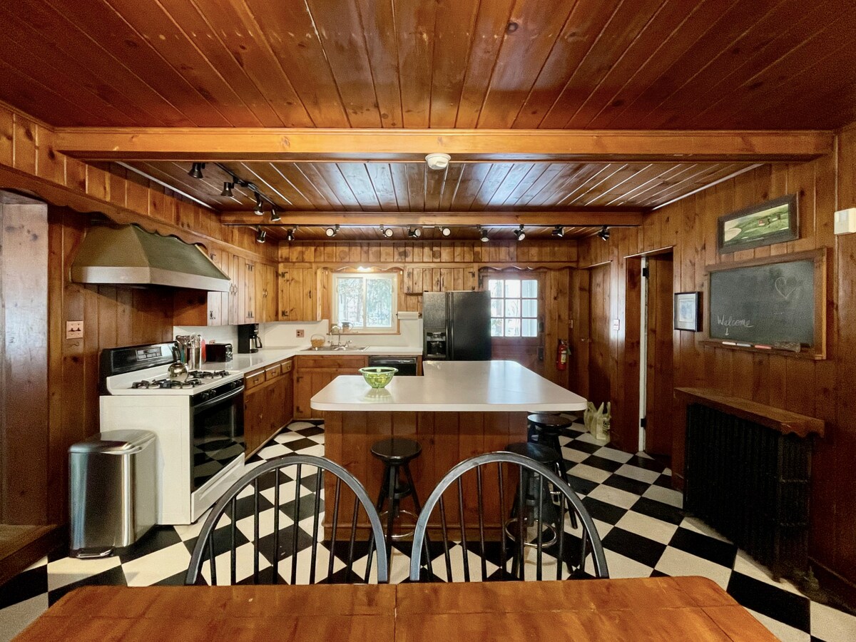 Cozy guest suite attached to main house in log cabin village. Full kitchen, dining area, wood stove, comfy queen bed, walk-in closet, games, 100 movies. Walk-in shower & built-in seat. Laundry room with door to deck area, bistro tables, firepit. The vaulted living room has pull-out love seat for one sleeper, TV [ROKU, You Tube TV, HULU, Netflix, Amazon, Disney], Blu-Ray player and Google Nest Mini. Enjoy breakfast items like fresh eggs, juice, milk, bread, coffee, tea and our homemade pizzelle.