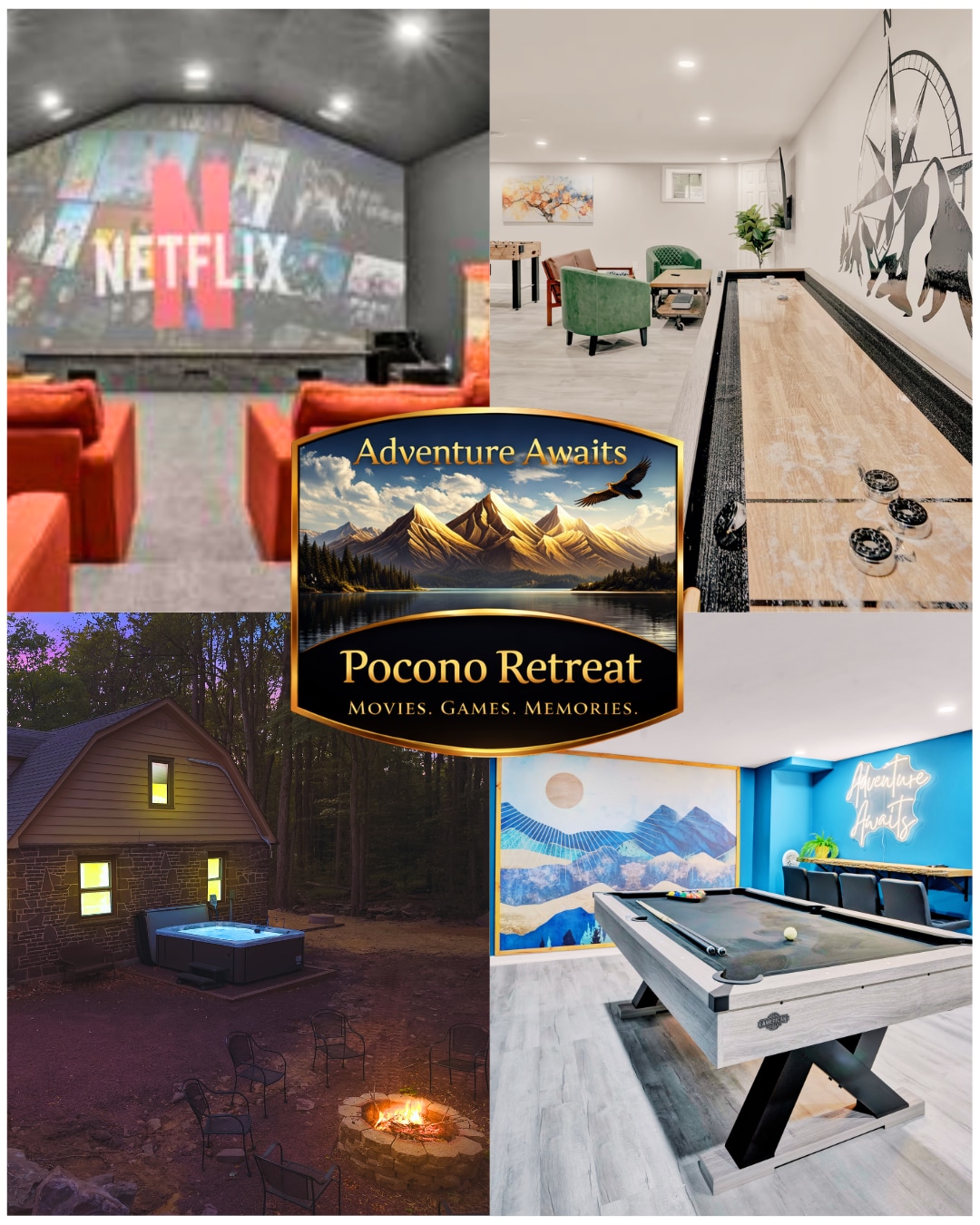 A truly unique stay in the Pocono Mountains, home to rolling mountain terrain, breathtakingly beautiful waterfalls, thriving woodlands, + 170 miles of winding river. Created with the “ultimate night in" themed experience, guests can sip wine under the stars in a private hot tub, + enjoy movies on their own 135" movie screen equipped w/ the world's first LED 4K gaming projector. Enjoy themed bedrooms and experience a stay where the forest takes you away as you stay in ultimate comfort + luxury.