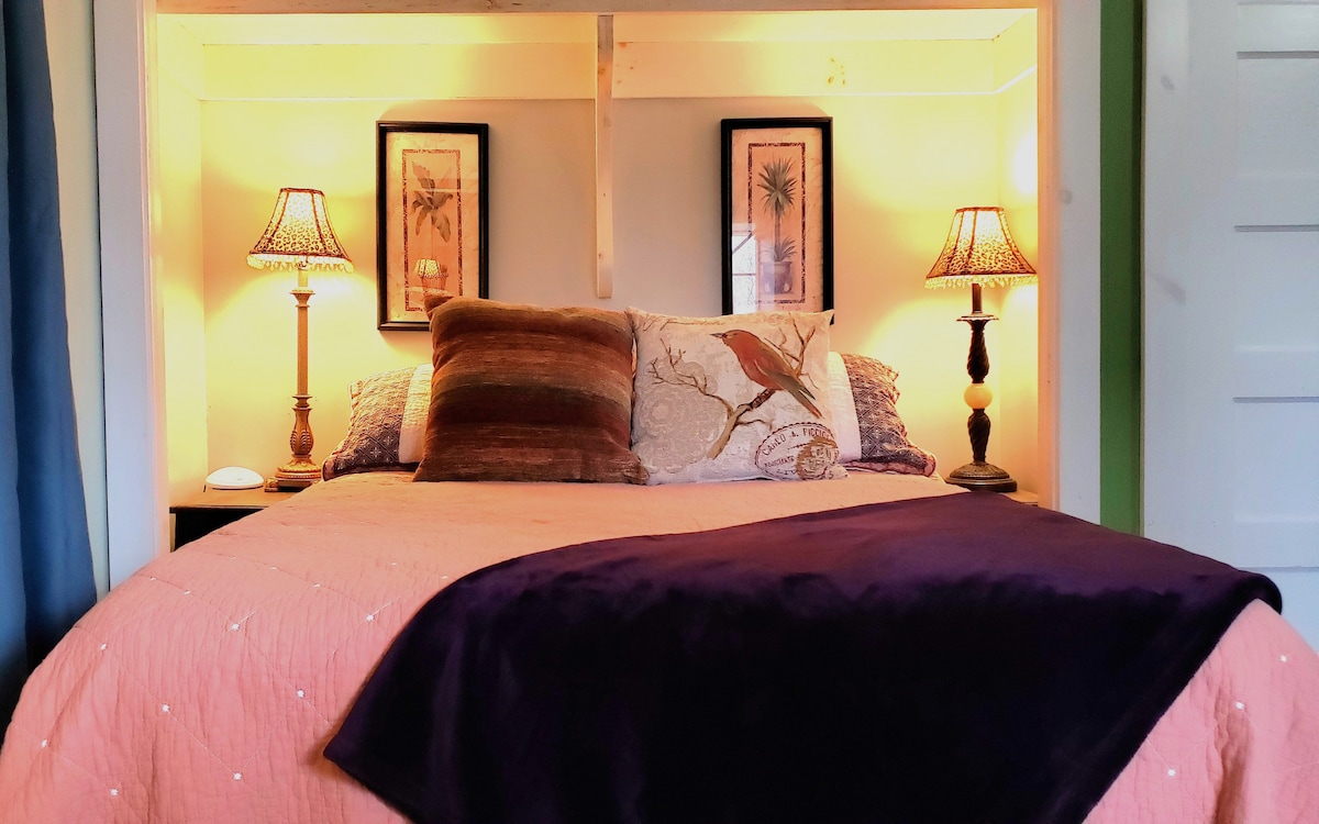 Escape to nature in a cozy glamping pod, offering the ideal mix of comfort and adventure in a peaceful setting. Each pod features a queen-size bed, a mini kitchenette with a coffee maker and microwave, and a dining table for two. Pods are equipped with heating and cooling, electricity, and WiFi. Though there's no bathroom inside, our luxury bathhouse with private stalls is just a short walk away and visible from your pod.