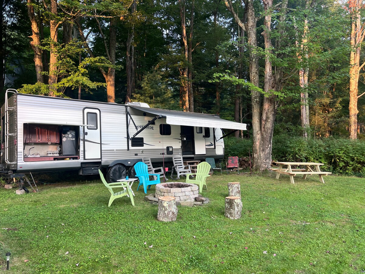 Located in a privately owned campground this cozy little camper is outfitted with everything you will need for your stay. Linens &Towels are provided along with a fully appointed Kitchen. Propane Grill & Firewood. This RV boasts a large covered porch with comfy wicker furniture to relax, enjoy a book or just have some coffee and listen to nature. large fire pit in the back and Gas Grill. We are 20 mins from Ricketts Glen State Park. We also offer EV charging (level 2)