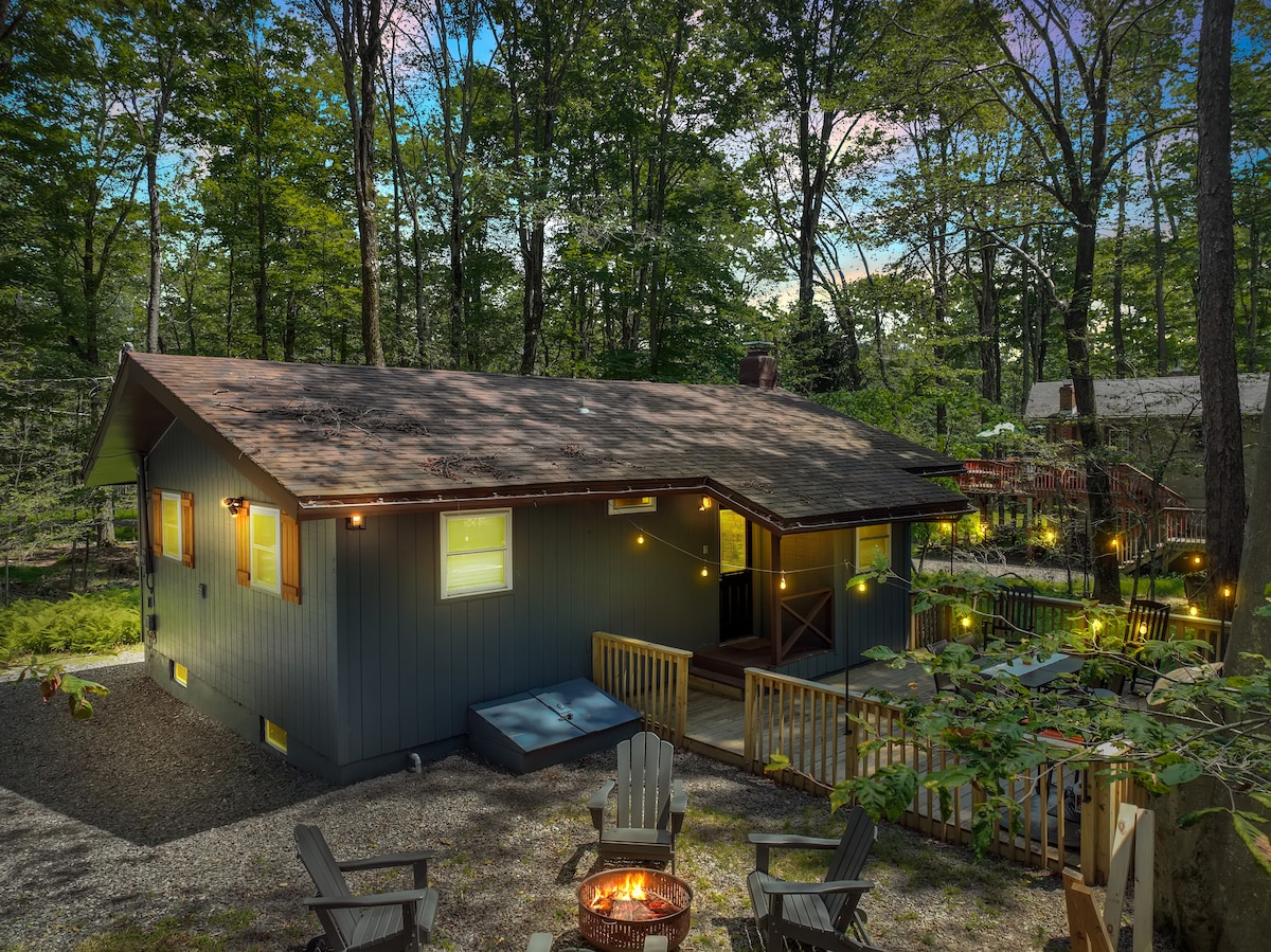 True mountain escape with designer finishes and high end appliances. The Cabin is situated near Bushkill Falls surrounded by a creek accessible for kayaking and fishing. The house is suited for 6 people 2 queen bedrooms on the main level and King Loft on the upper level. Open kitchen plan that connects with the living space highlighted by a beautiful fireplace. Beautiful deck for entertaining with a fire pit. Only 20mins away from Shawnee Mountain & 24/7 Supermarket.