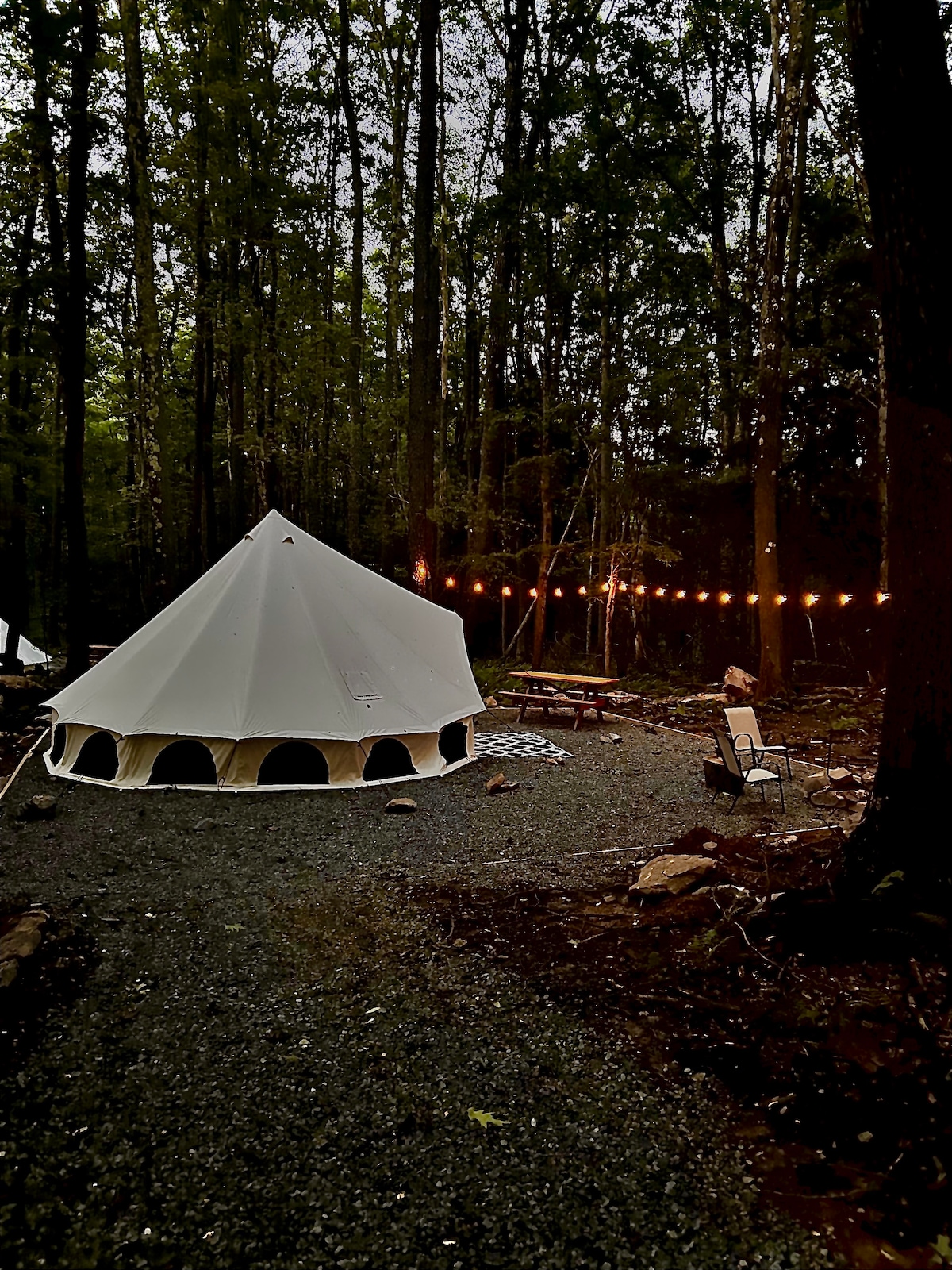 Venture to the endless mountains and relax in your own cozy glamping tent. Experience the perfect blend of nature and comfort—just bring your food and drinks. We provide a queen-size bed with soft sheets and warm blankets for a restful night’s sleep. Step outside your tent to unwind on your deck and take in some of the best sunset views in NEPA. HIGHLIGHTS ✓ Cozy space for two ✓ Stargazing, and (communal/shared) hot tub, outdoor kitchenette, fire pit ✓ Trails, views & outdoor peace