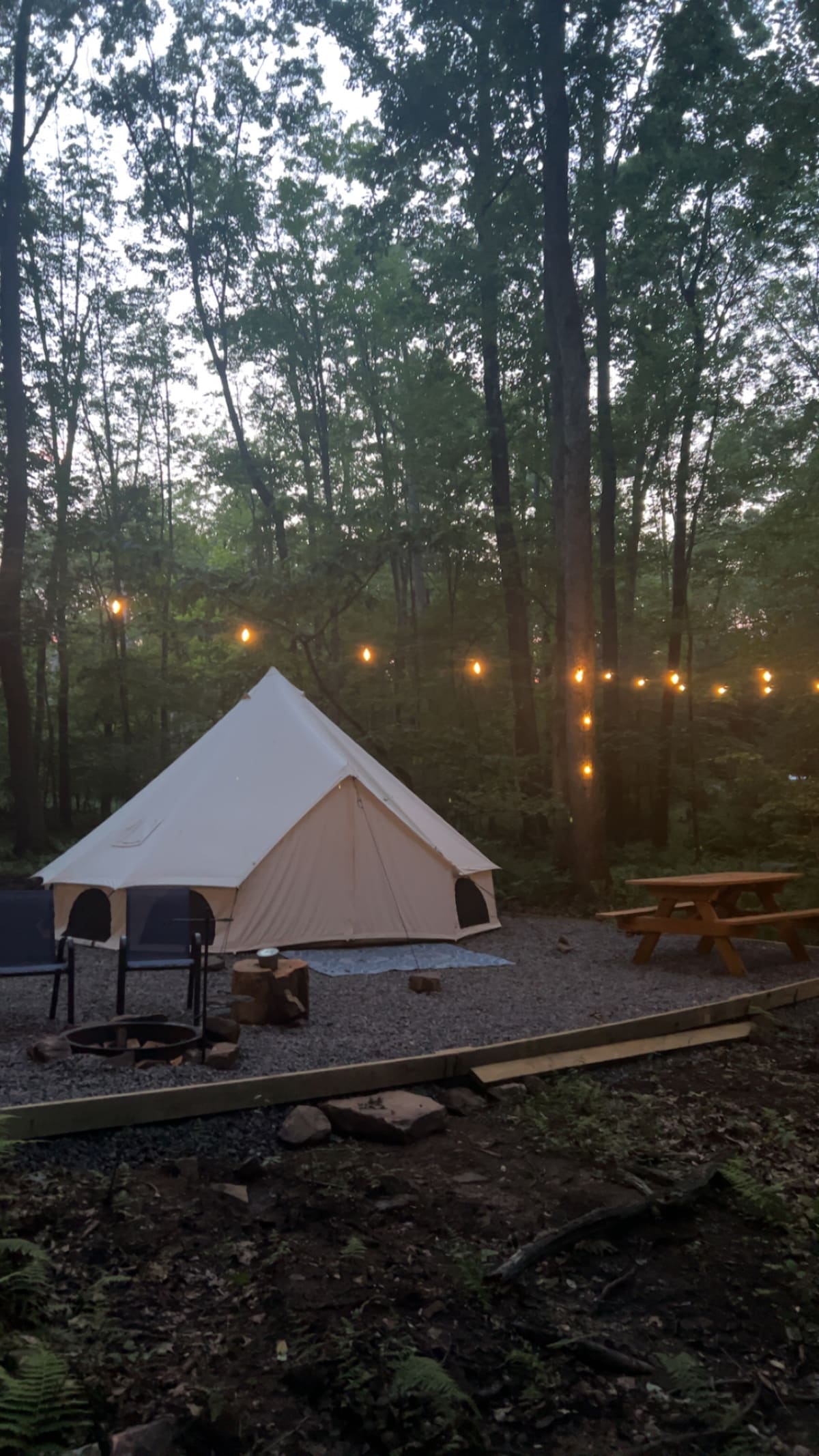 Venture to the endless mountains and relax in your own cozy glamping tent. Experience the perfect blend of nature and comfort—just bring your food and drinks. We provide a queen-size bed with soft sheets and warm blankets for a restful night’s sleep. Step outside your tent to unwind on your deck and take in some of the best sunset views in NEPA. HIGHLIGHTS ✓ Cozy space for two ✓ Stargazing, and (communal/shared) hot tub, outdoor kitchenette, fire pit ✓ Trails, views & outdoor peace