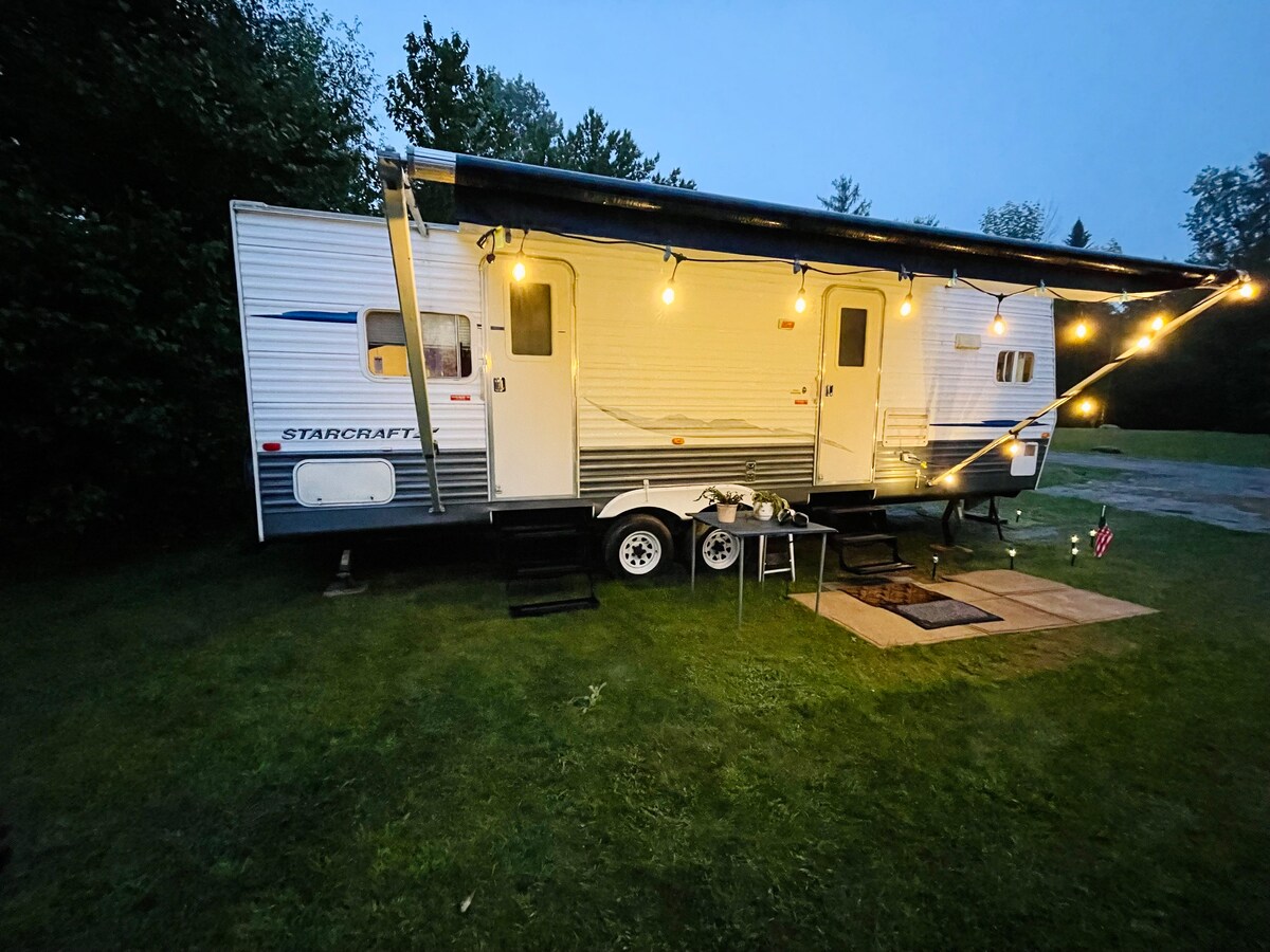 Peaceful, spacious RV parked in a wooded setting on Tracy Pond. You have all the comforts of home plus a beautiful setting in this 30 foot trailer. Full kitchen, comfy theater seating with a great WiFi connection. You can fish in the lake, or use the kayaks to watch the eagles soar and otters play. You have a fire pit and large picnic table to enjoy the outdoors. Only 15 minutes to downtown Bangor and the airport. One hour to Acadia National Park.