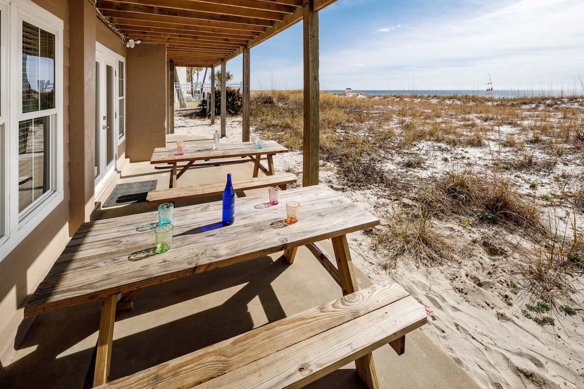 This cozy 4 Bedroom, 4.5 Bath Gulf-front beach home sleeps 12, and is located on the white sand beaches of Navarre Beach. Enjoy unending Gulf views from the coastal cottage style living room and two of the bedrooms. Have a family meal around the large farmhouse style dining table or outside on the rear deck. The deck is the best place to hear the waves breaking and enjoy a drink. At the end of a sun-soaked day on the beach, there's entertainment for everyone with flat screen TVs in every room.