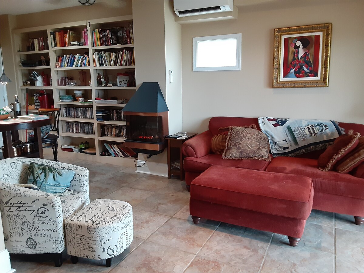 Waterfront private guest suite with ensuite bedroom including an ultra comfortable king-sized bed. Walk out of your bedroom’s sliding door to a private deck steps away from our beach and pier where you can enjoy swimming, paddle boarding, kayaking or just enjoy the view! You will have your own private full kitchen. Book a massage with our massage therapist before your stay and enjoy your massage just steps away from your suite. Additional bed and bath available as well.