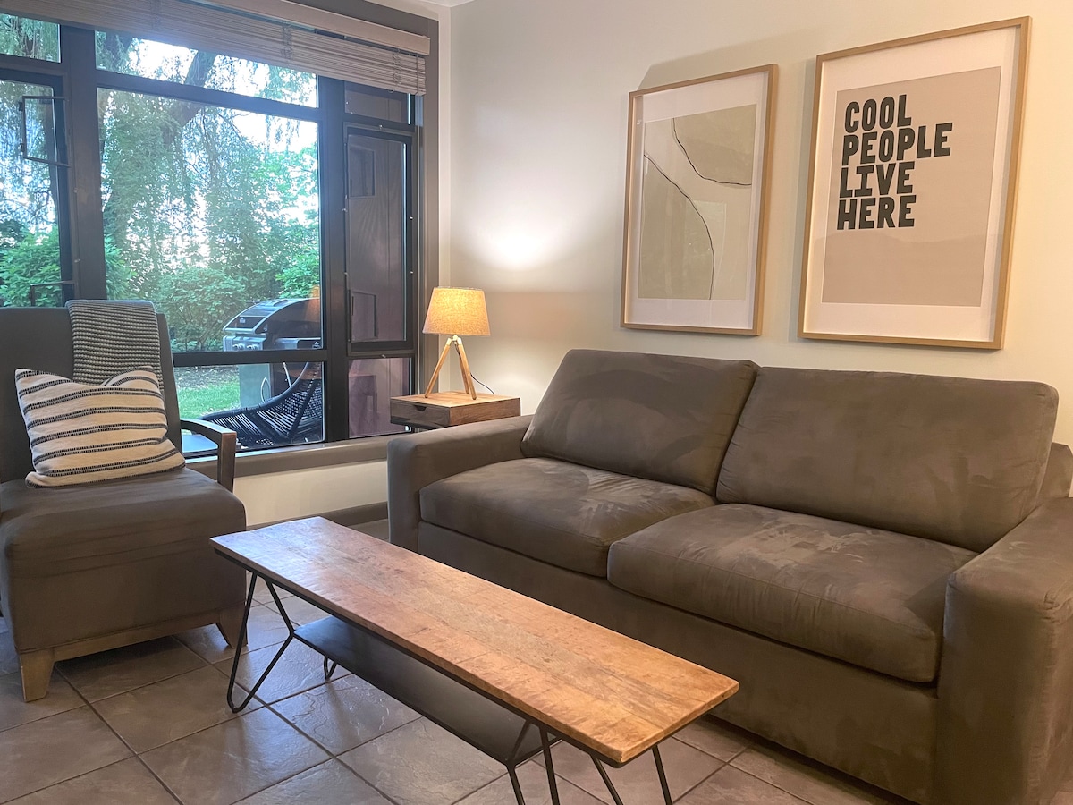 Relax in this gorgeous condo while enjoying breathtaking mountain views from large windows. We use all unscented, almost 100% natural cleaning products. Details below. This 5-star location is a quick stroll to the waterfront, hiking and biking trails, cafes, restaurants, shopping and arts district. The condo is fully equipped for an effortless stay. Enjoy private resort amenities: indoor & outdoor pools, hot tubs, fitness centre & steam room. Pets are welcome with approval.