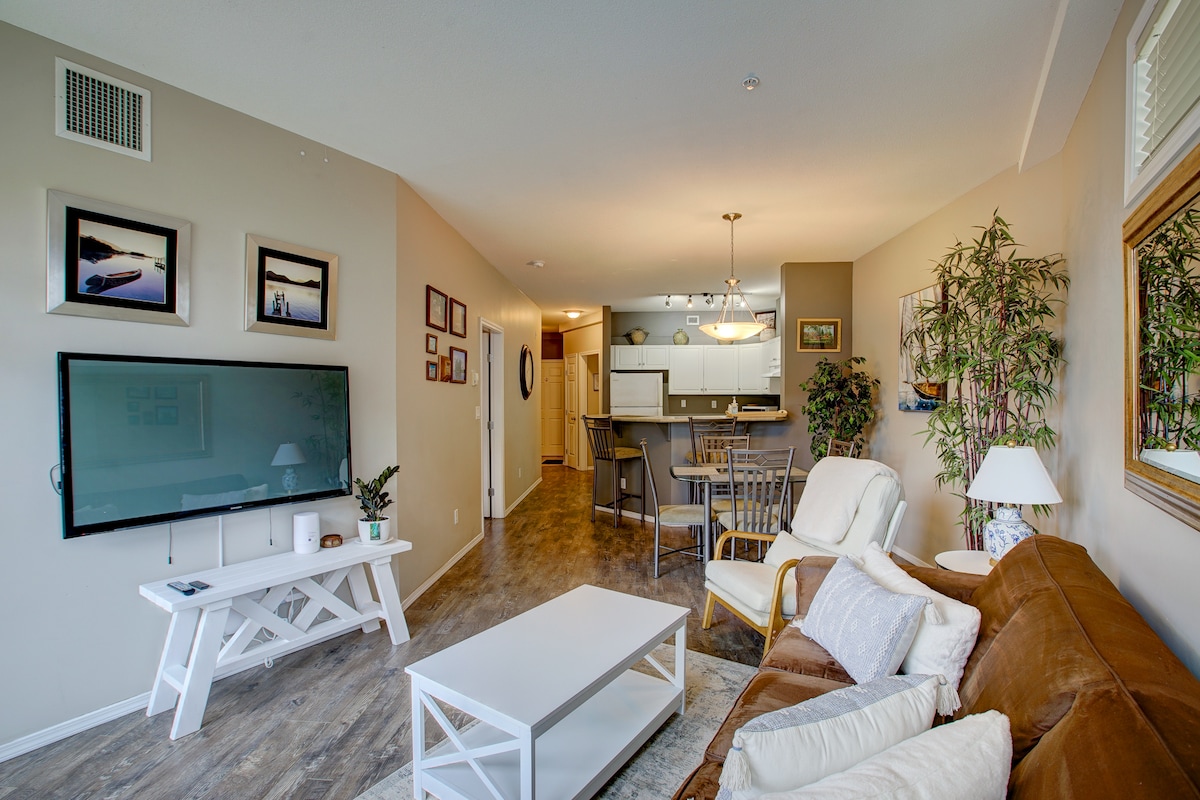 NO Cleaning Fee! Enjoy this bright 2-bed/2-bath condo in the heart of Kelowna. Sleeps 6 with a king, queen, and queen sofa-bed. Cook in a full kitchen, relax by the gas fireplace, stream Netflix on the large TV, or sip morning coffee on the balcony. A very walkable neighbourhood with nearby parks, beaches, wineries, breweries, shops, and restaurants. Free self check-in, secure parking, in-suite laundry, central heat/air, and high-speed WiFi. 2 pools with hot tubs, one open year round!