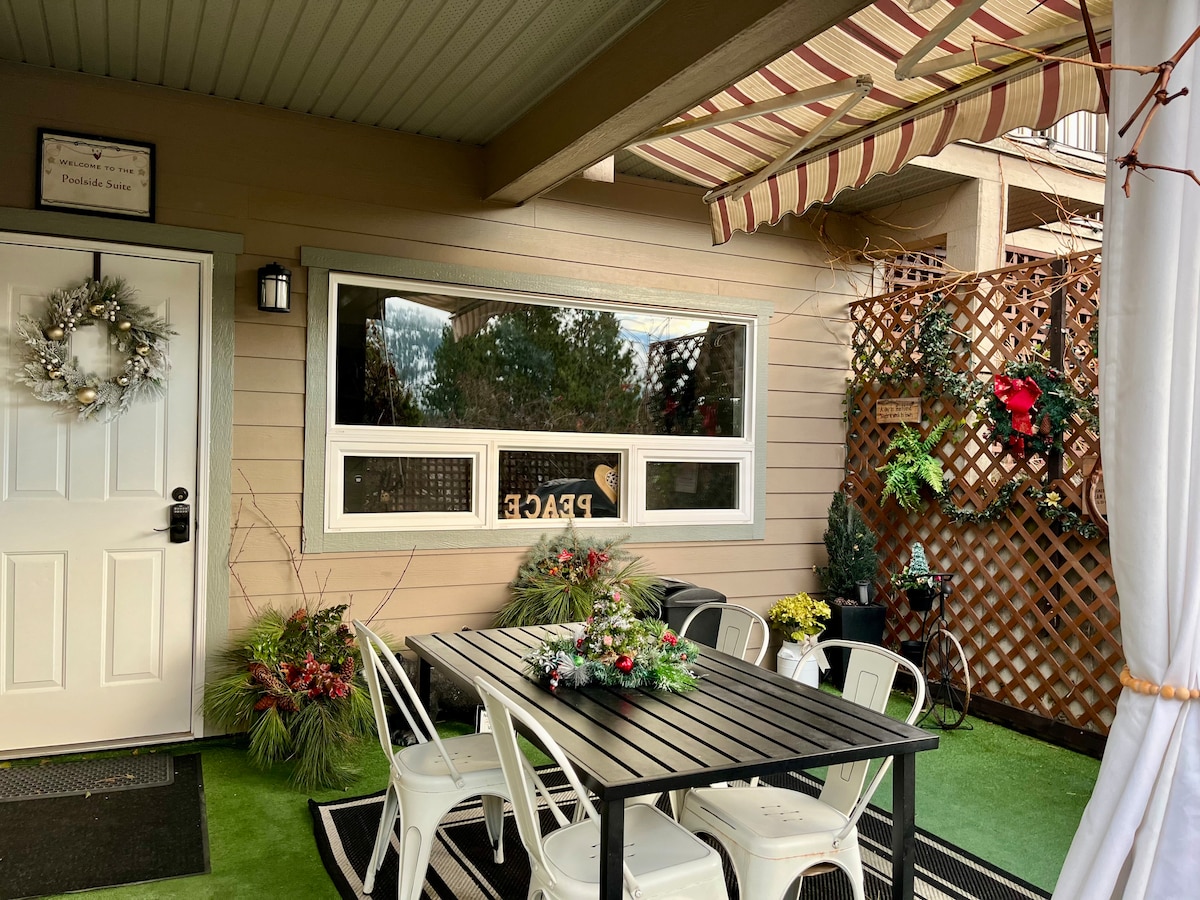 This self contained, modern, renovated 'pool house' is a city inspected, licensed (#00112755) suite that offers a private setting, beautiful landscaping, including a real palm tree,🌴 pool and many sitting areas to enjoy the property. Located steps from Skaha Lake, below Skaha Bluffs Provincial Park and walking distance to Painted Rock Winery. Enjoy our kayaks and SUPs as well as a shed to lock your bikes/gear. Here's your opportunity to enjoy the Okanagan lifestyle and all it has to offer.