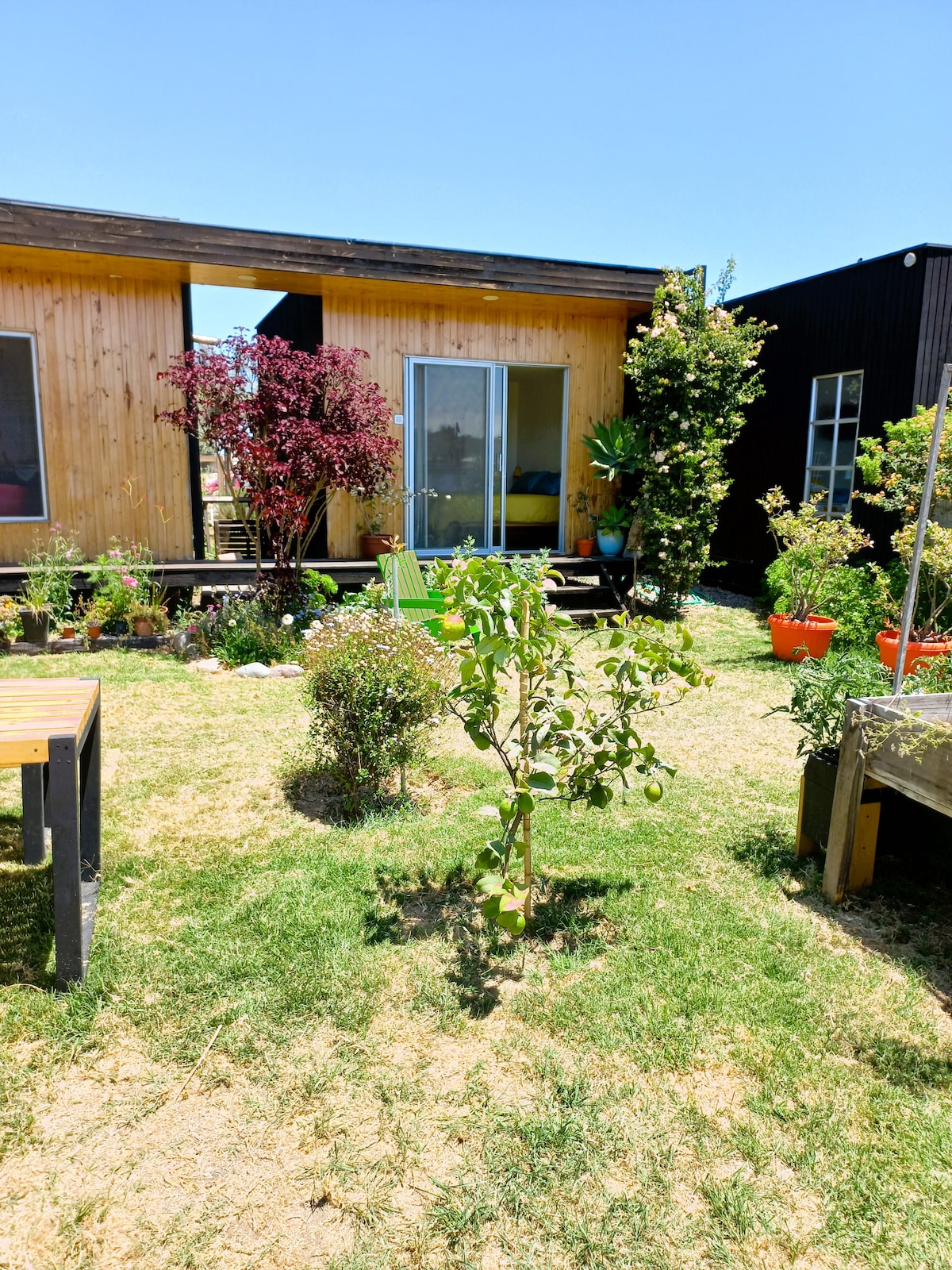 Our guest suite, ideal for singles or couples, is independent from our house and has a private entrance. The guest suite has a modern exterior and a comfortable interior. Our house is located on an old family farm near the beach (1.5 blocks to the beach). Our location is close to several beachside restaurants and bars. The little kitchen has a toaster oven, microwave, electric kettle and frigobar (small fridge) but does not have a cooktop. No es apropiada para niños menores de 7 años.