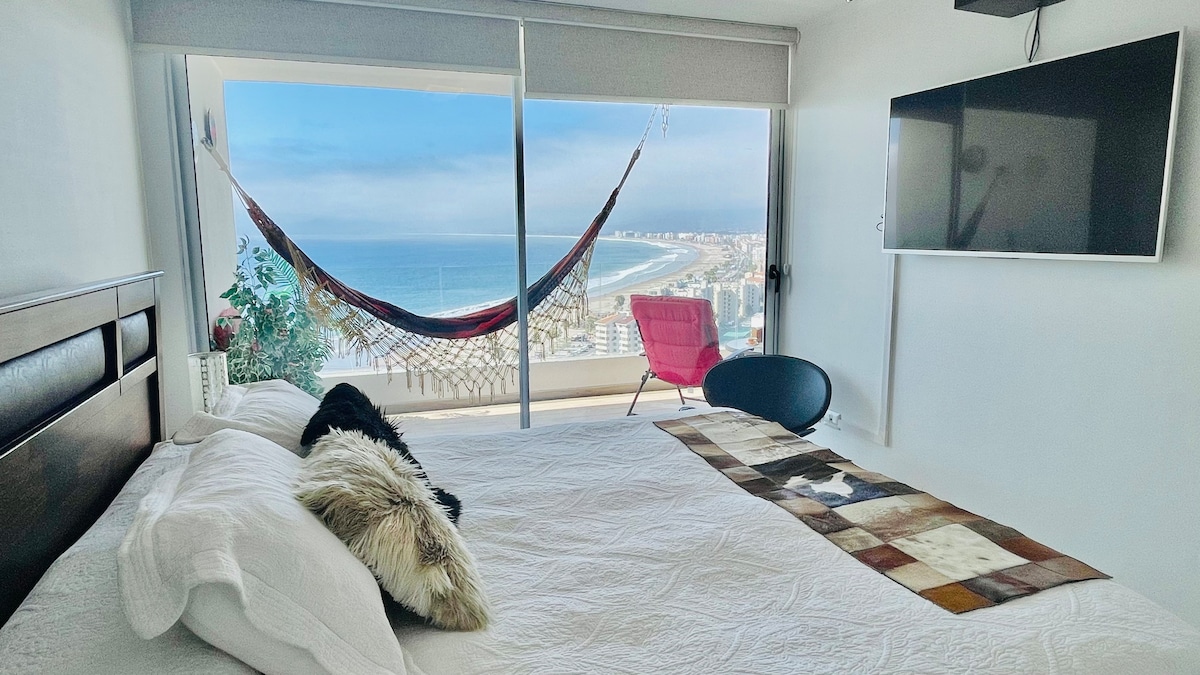 Escapate frente al mar con tu familia. En cualquier época del año, sientete como si estuvieras en tu hogar. Atardeceres desde la terraza, donde se ve toda la bahía de coquimbo y la serena. En las noches cielos despejados y estrellados, respirando el aire marino. Todo esto frente del mar, piso 19, para 5 personas. A un costado del casino Enjoy. piscina al aire libre y vista al infinito. Kinchos Con vista panoramica. Estacionamiento gratis. Saliendo del condominio avenida costanera
