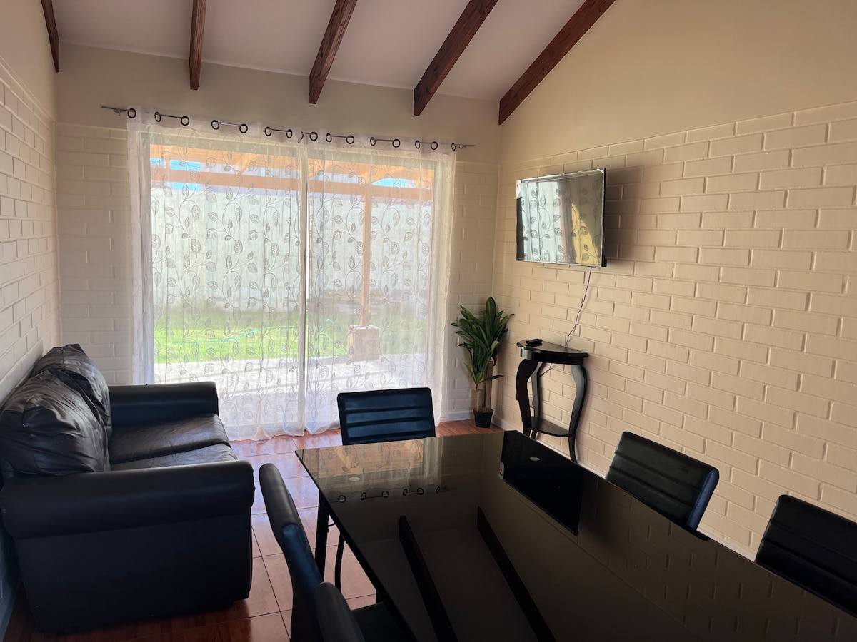Relájate en esta tranquila casa, la cual cuenta con acceso a playa a menos de una cuadra, cercana a la turística Caleta San Pedro, zona de restaurant, la cual se encuentra a menos de 10 min. caminando y 3 min. en vehículo. Disfruta y relájate en nuestro patio, que cuenta con un juego de terraza habilitado para 6 personas, mesa de centro y parrilla, donde puedes estar tranquilamente y disfrutar de tus comidas en el exterior, tomando el sol o la brisa marina.