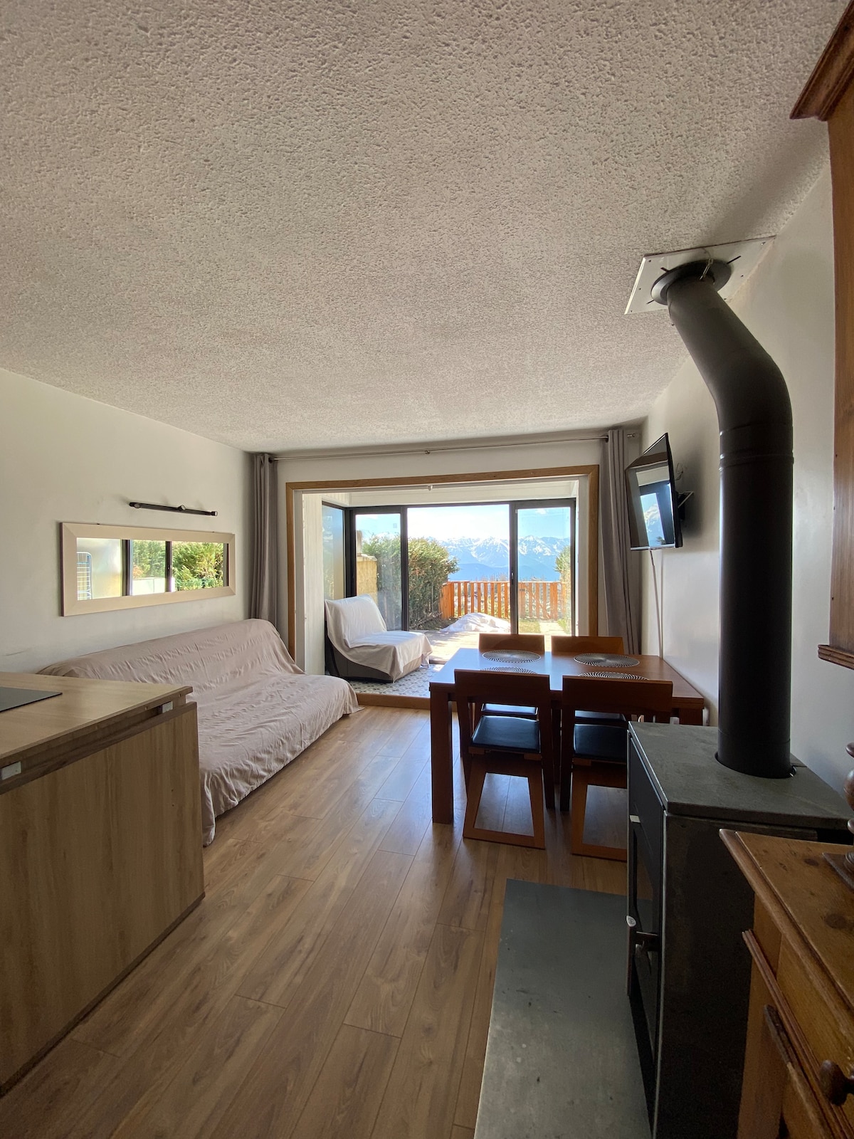 AU PIED DES PISTES, DUPLEX EN DERNIER ETAGE ET PARKING COUVERT. Entièrement rénové par architecte, 60 m², 2 chambres et 2 SDB dont une avec baignoire, 2 wc dont un indépendant, plein sud avec une terrasse, belle vue pistes et montagne. Pas de vis à vis. Pistes à 30 mètres par le téléski du Riou. Situé au cœur du village, pas de voiture nécessaire pendant le séjour. Parking en sous sol couvert. Cuisine équipée neuve et électroménager neuf . LE POÊLE À BOIS N’EST PAS UTILISABLE.