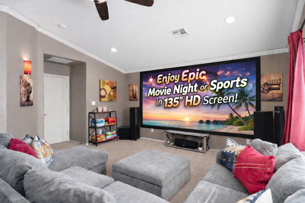 Amazing location!! Step into the comforts of the spacious and comfortable home with 4 bedrooms & 3 full bathrooms, situated in a quiet community. Close to restaurants, shops, entertainment and sports. ✔140" HD Screen Theater Movie Room ✔ Light breakfast included ✔ Private backyard with seating area & NEW Hot Tub ✔ Air Hockey + Foosball ✔ Fully Equipped Kitchen ✔ Community swimming pool (summer only) ✔ Streaming apps ✔ Board games, books & toys ✔ Baby gear ✔ Soft water ↓↓See more below!↓↓