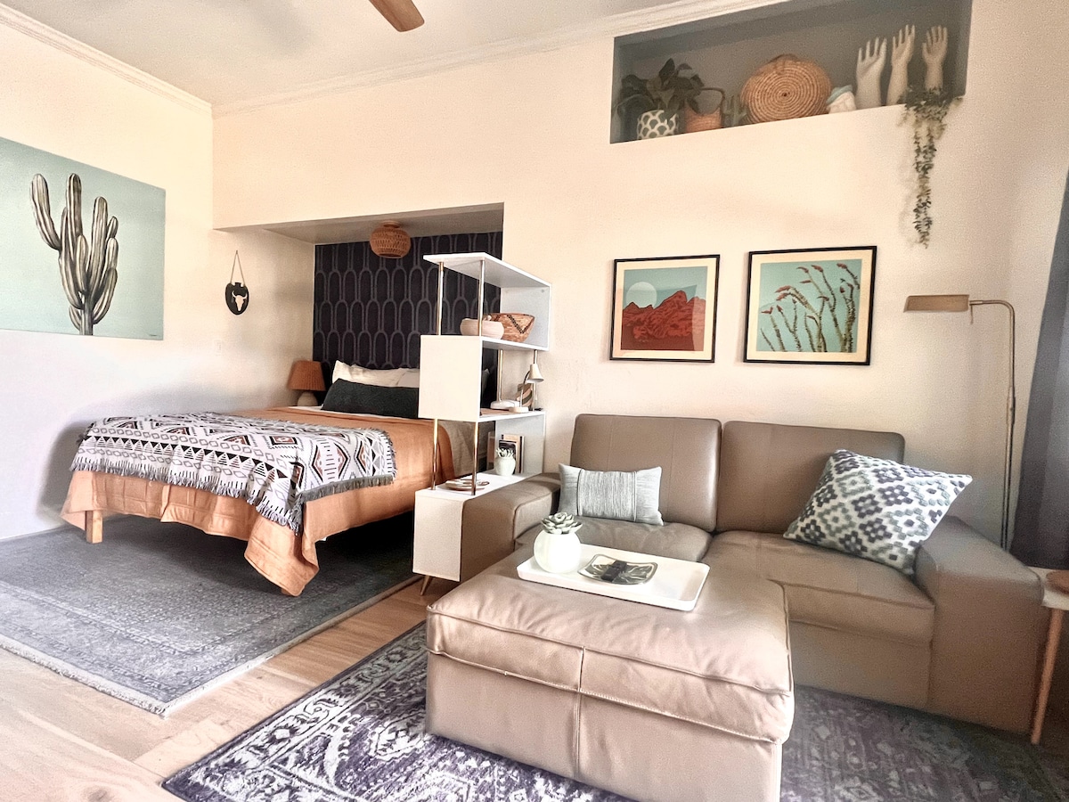 Fully remodeled studio located in a gated 10 unit condo complex and includes a private gated patio, full kitchen, washer and dryer, lightning fast Wi-fi and a 65" Samsung smart TV. Endless entertainment and restaurant choices within a few minutes walk. Distance from the unit to..... Convention Center - 1.0 mile Footprint Center - 1.0 mile Chase Field - 1.3 mile The Van Buren - 0.3 mile Arizona Financial Theatre - 0.6 Mile Feel free to ask if you need another landmark mapped.