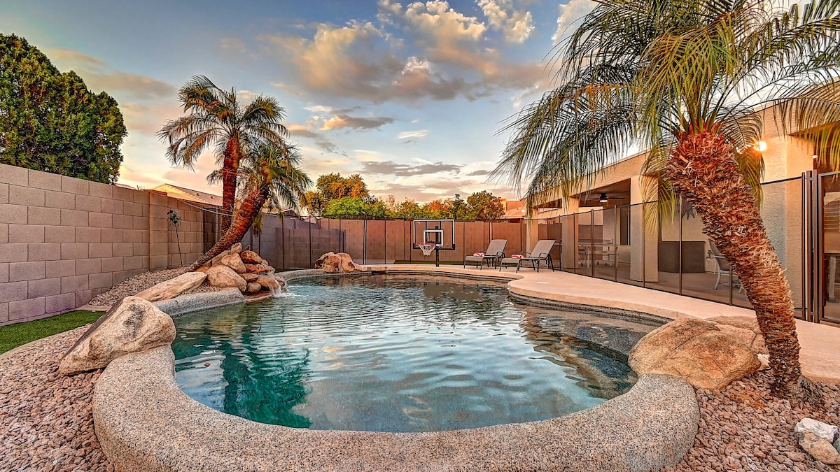 🏊 Year-round relaxation in heated saltwater pool & spa (gentle on skin/eyes) 🔥 Cozy up to fire features 🍳 Fully stocked kitchen + outdoor propane BBQ grill 🎱 Game room with pool table, foosball, darts, & big-screen TV 🌞 Outdoor dining area & bar for enjoying AZ weather 📺 Outdoor TV for games/movies while soaking in the spa 🚗 Easy access to 2 major freeways 🎨 Artfully & uniquely decorated Resort-like escape in Phoenix (Glendale mailing) – perfect for family, golf trips & holidays