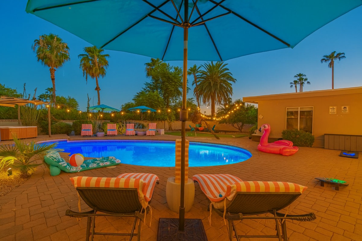 Discover your stylish oasis in South Scottsdale, moments from Old Town. This 4-bedroom w/ 7 beds retreat features all new furniture, TVs in every room, pool table, arcade game, and memory foam mattresses. The fully remodeled house offers a dazzling sunset mural as you walk out to the spacious backyard for games, BBQ, hammock, outdoor dining table, plenty of seating and a beautiful diving heated pool (high 70s to mid 80s, included in price). Have the ultimate time at this relaxation paradise.