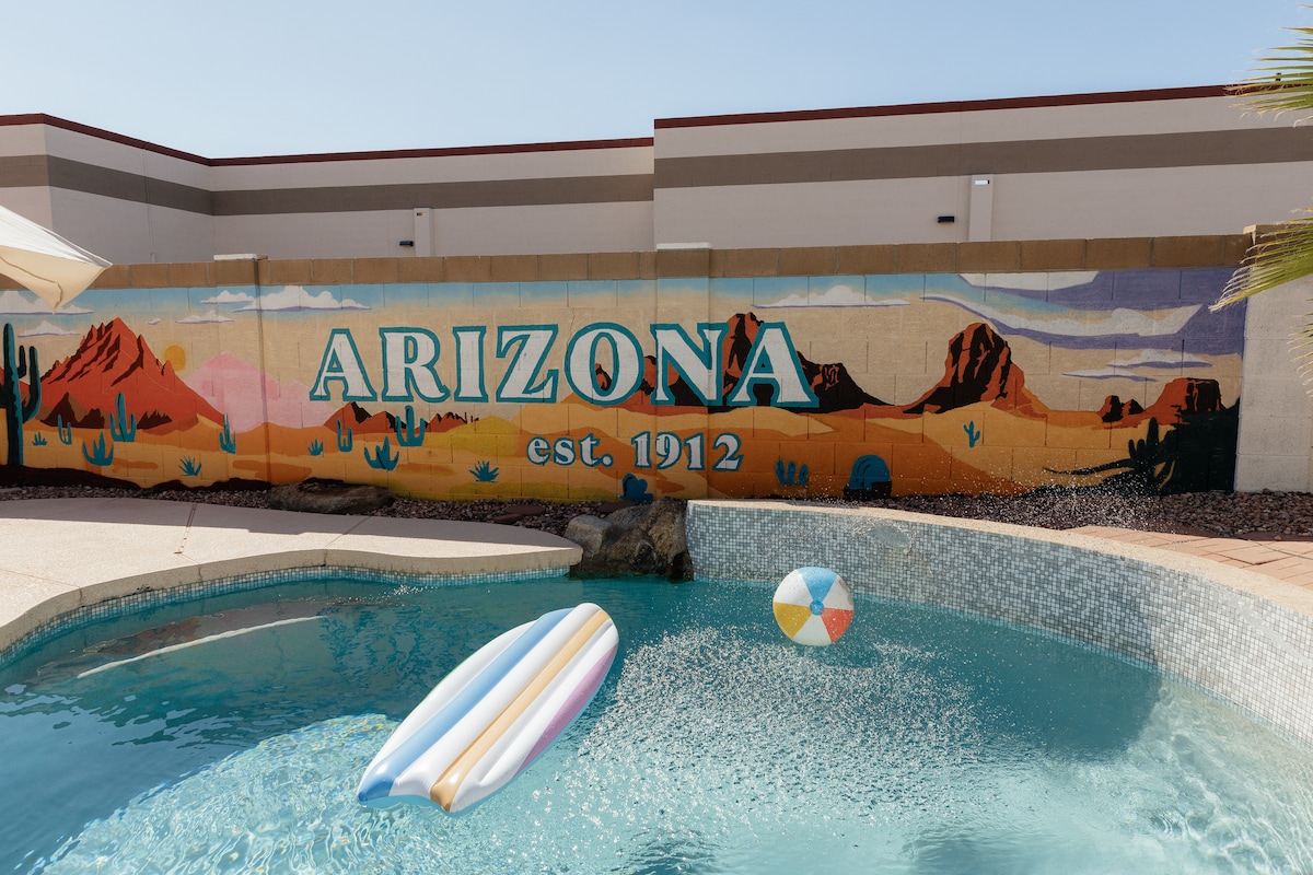 🏊 Year-round relaxation in heated saltwater pool & spa (gentle on skin/eyes) 🔥 Cozy up to fire features 🍳 Fully stocked kitchen + outdoor propane BBQ grill 🎱 Game room with pool table, foosball, darts, & big-screen TV 🌞 Outdoor dining area & bar for enjoying AZ weather 📺 Outdoor TV for games/movies while soaking in the spa 🚗 Easy access to 2 major freeways 🎨 Artfully & uniquely decorated Resort-like escape in Phoenix (Glendale mailing) – perfect for family, golf trips & holidays