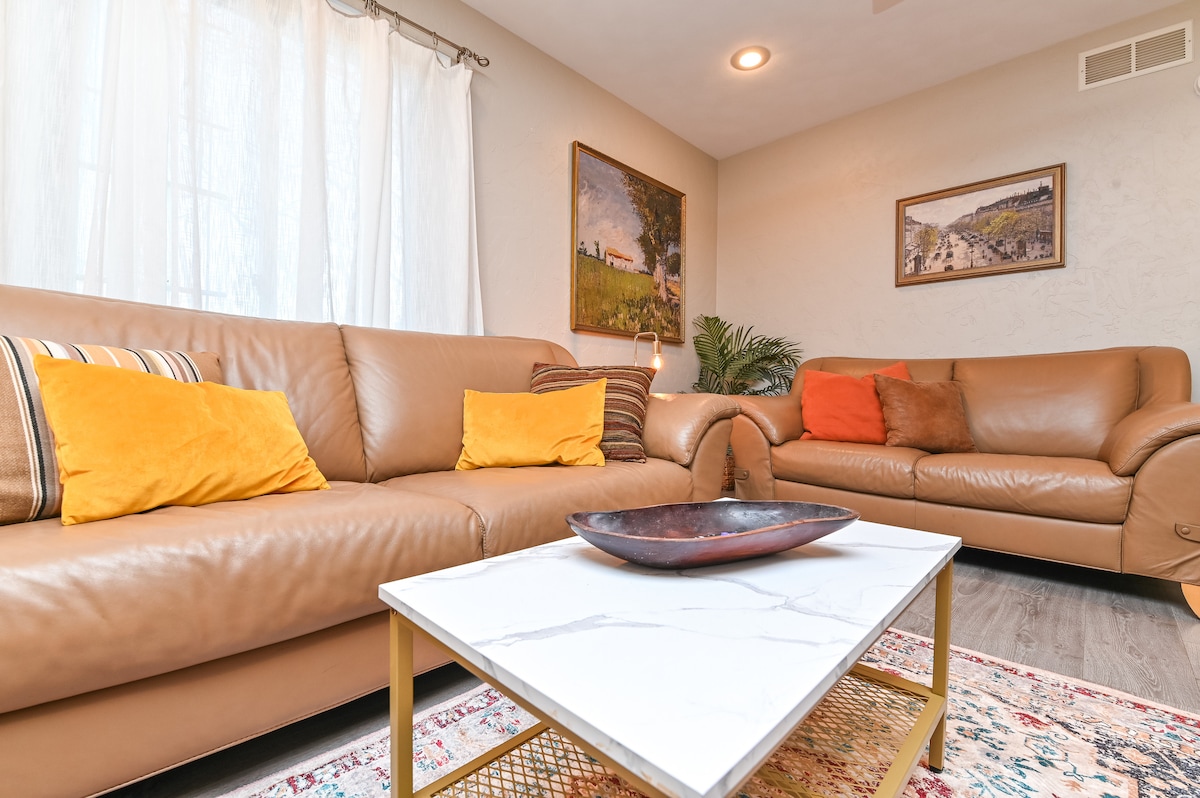 Inside and out, this brick ranch has been intentionally renovated to make your stay comfortable and easy. 3 BR, 1BA and 3 separate living spaces - living room, work space/den, and basement workout room/lounge; spacious for your group! Well-equipped kitchen includes all you'll need to prepare in-house meals and many coffee-making options! Indoor electric fireplace, Outdoor patio. Safe and very quiet neighborhood, centrally-located. Stay in or go out - this is the place for business or rest!