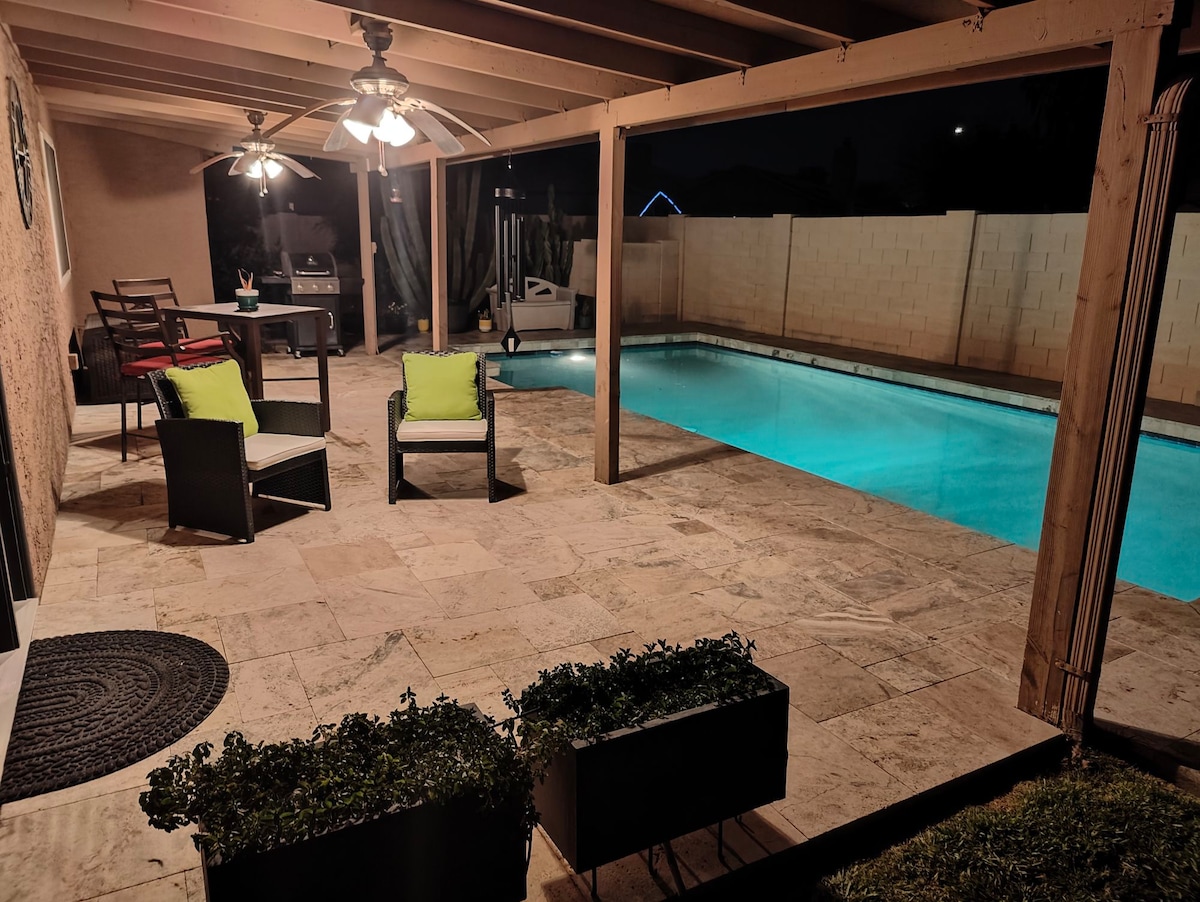 Please put in your dates for accurate pricing. Pool is heated in the winter and cooled in summer, hot tub is at 102. No extra charge! You couldn’t pick a better oasis that is centrally-located in Peacock Village. You will feel as though you have come to a private retreat perfect for honeymooners, couples, families or by yourself for a recharge! Near P83 with tons of restaurants, shopping, the stadium and world class golfing! Grass yard for Crochet and Cornhole. Garage is not available.