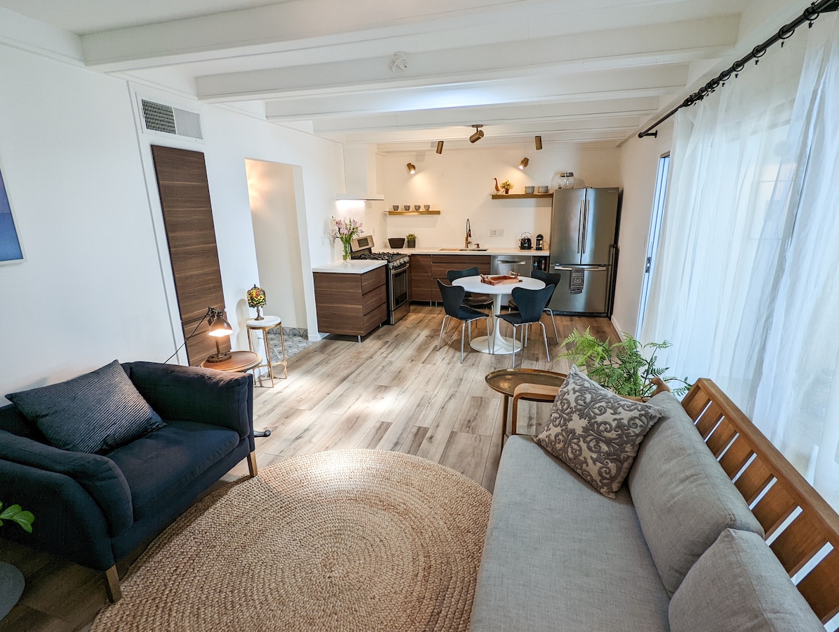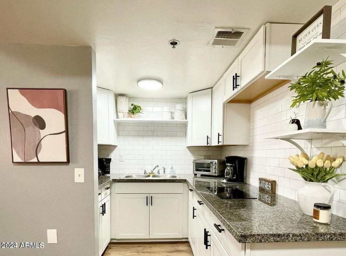 Enjoy a stylish experience at this centrally-located studio. This spacious one bedroom one bath studio is perfect for a couple or solo traveler. Amenities include a fully stocked kitchen, coffee bar, SmartTV, WiFi, games, stackable washer dryer, and a small patio with grill and fire-pit. Walking distance to popular dining destinations Little Miss BBQ, The Vig, Timo Wine Bar, and Sushi Friend. Conveniently located 15 minutes from Phoenix Sky Harbor Airport and 25 minutes from State Farm Stadium.