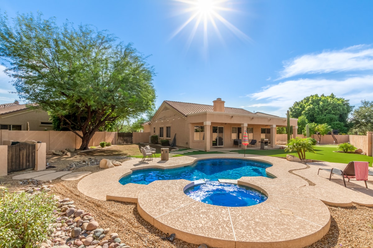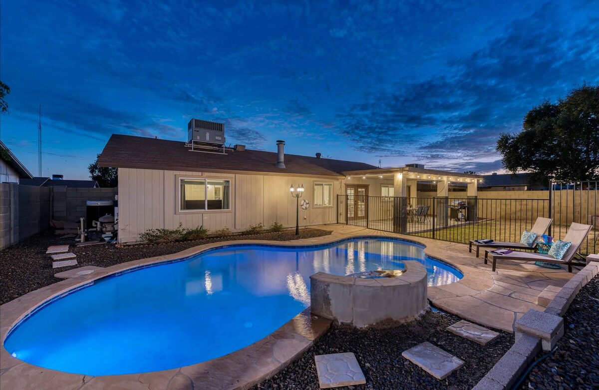 Bask in AZ sunshine at this designer oasis! Private HEATED Pool. (No charge to heat the pool) Pets stay for FREE. A guest favorite! Dive into the heated pool or cozy up next to the fireplace in this spacious, remodeled vacation home. Enjoy the large kitchen, shaded patio, lush backyard and more! Nearby trails, parks, shopping. With a rare blend of luxury, comfort and floorplan, this special residence welcomes all. Reserve your unforgettable getaway today! GREAT location! We support equality.
