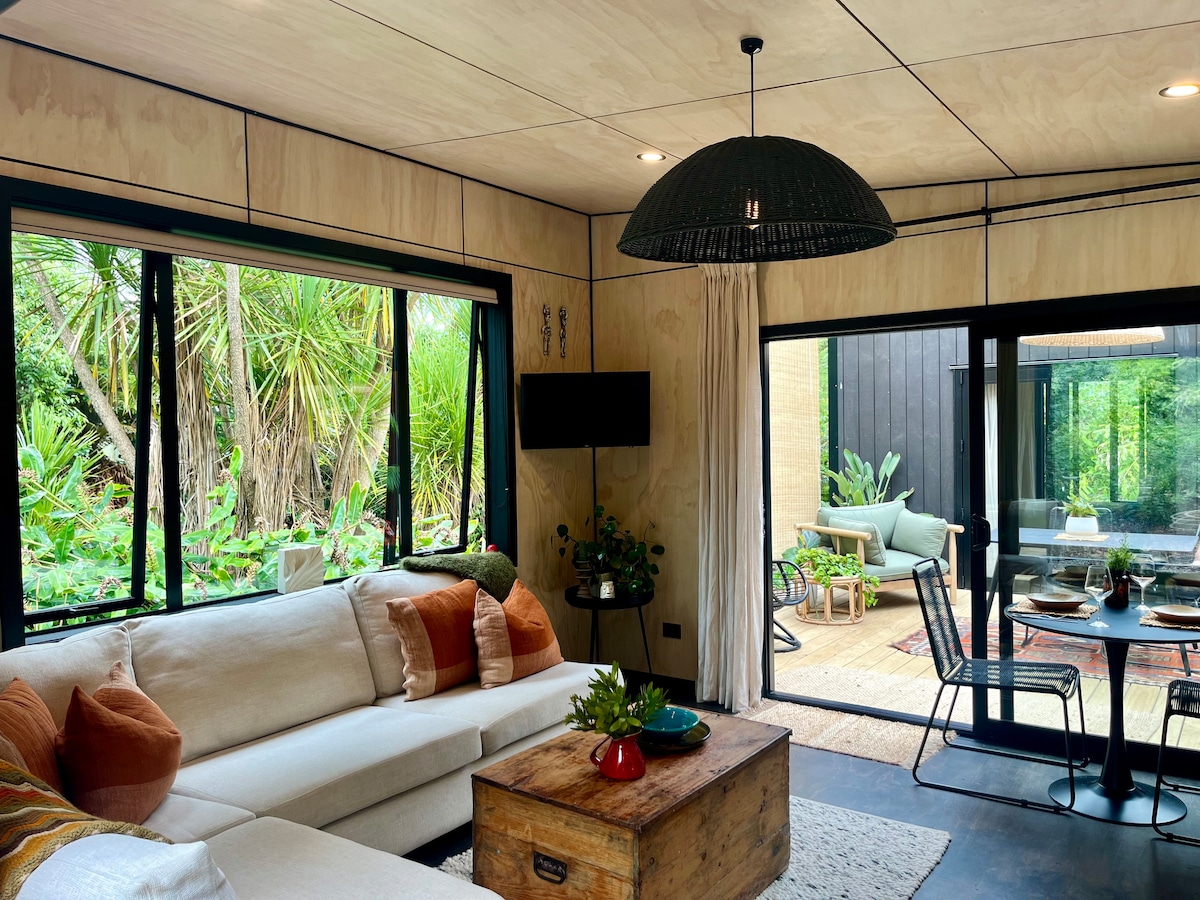 The Gazebo is a unique small space at the end of the Raglan harbour. Privately sited on a small farm founded on permaculture principles, The Gazebo features native timber, a mezzanine relaxation platform, and unique indoor-outdoor living spaces. With an outdoor galley kitchen and gas-heated shower among the magnolias, you will have all the comforts of home while being brought into the outdoors. The private outdoor bath overlooking the sunset across the harbour is a stand-out feature.