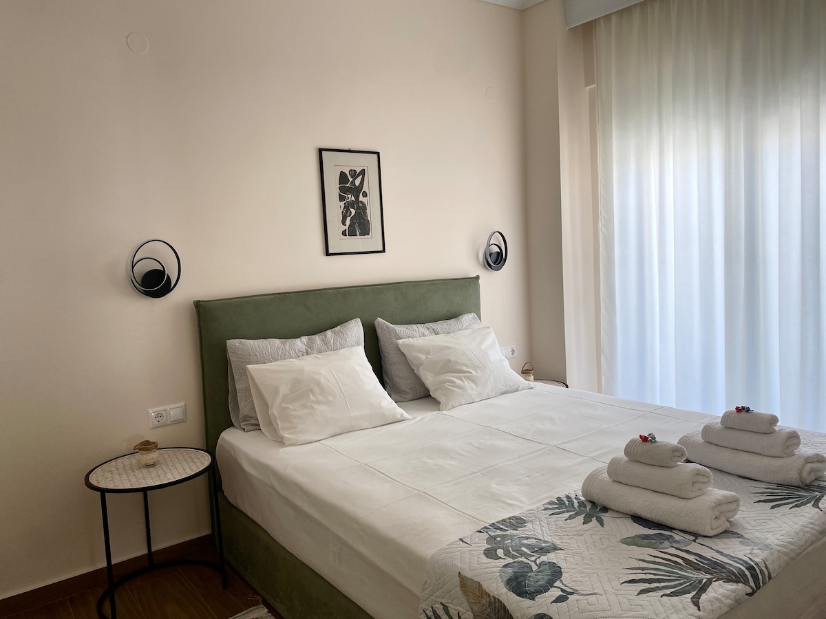 Our unique apartment is located on the second floor of a dreamy house in Epanomi. It is a 3' car ride from the beach, in a quiet neighborhood. You will enjoy the view of Olympus mountain, the sea and the sunset! A super comfy bed, a cozy sofa bed for two, a beautifully designed space with a jacuzzi, a huge balcony, an amazing garden and barbecue, safe parking, are some of the amenities. Epanomi is very closed to Thessaliniki and Makedonia airport!