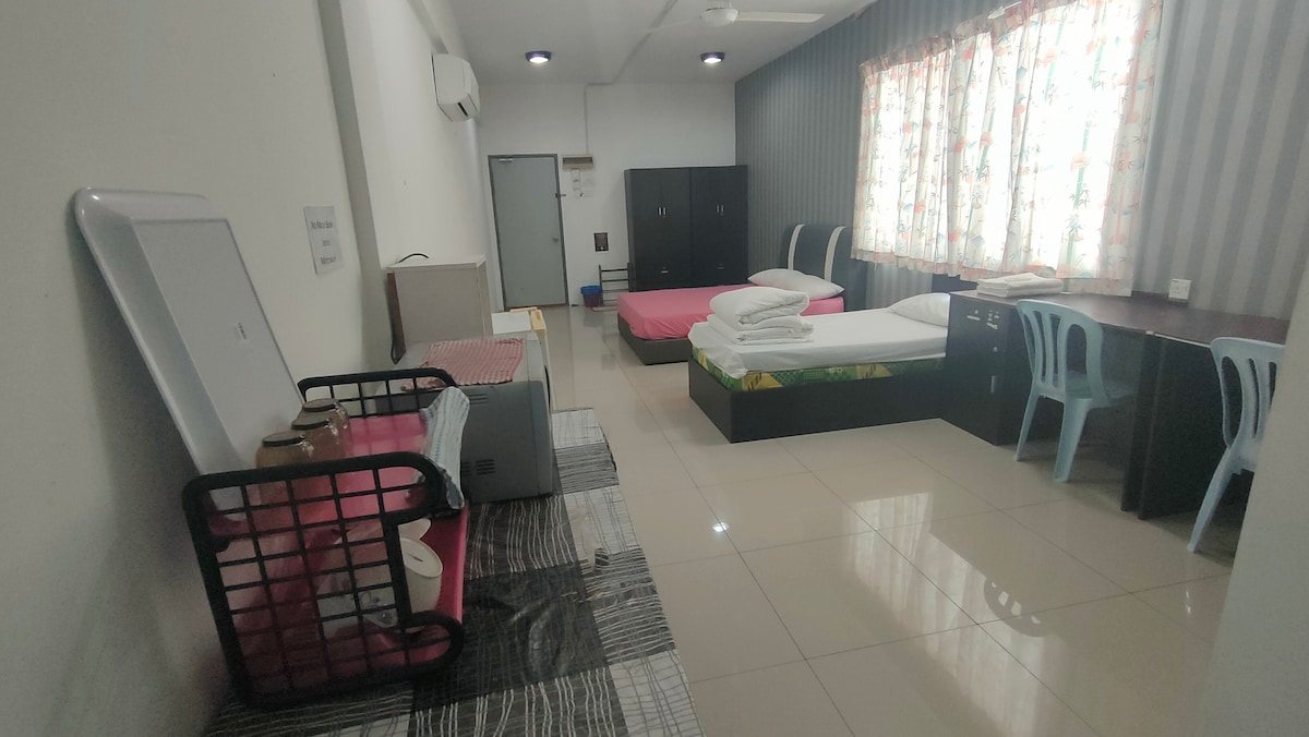A spacious fully furnished Studio for home-stay located at the 1st Floor (1 Queen Beds and 1 single beds) with basic amenities such as air-conditional, fan, refrigerator, water heater, microwave, kettle, toiletries and etc. How to get your key? - We operate based on Self Check-in system. Upon confirm booking, we will whats-app you the check-in guide accordingly.