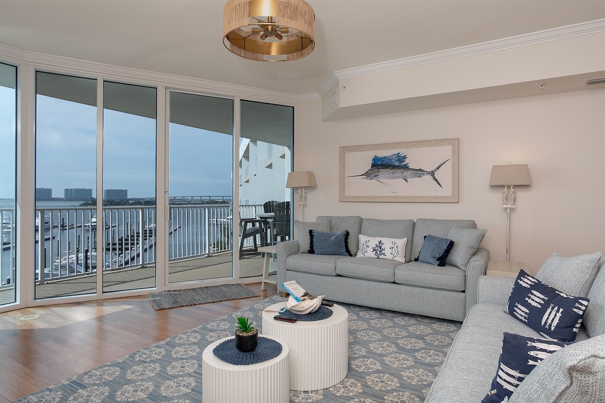 Updated luxury corner 1 bed/1 bath waterfront! Tile floors thru out, private bedroom w/king bed, bunk beds (twin size small )in the hallway, queen sleeper sofa. Full stocked kitchen w/brand new appliances. Covered waterfront corner balcony w/grill! 3.50 miles from beach! On-site dining, night life, Movie Theater, marina w/charter boats/cruises, Arcade, Ferris wheel, shopping, the Wharf Ampitheater, the Oasis resort pool w/wave pool,lazy river,slides,hot tub plus seasonal bar/restaurant at pool!