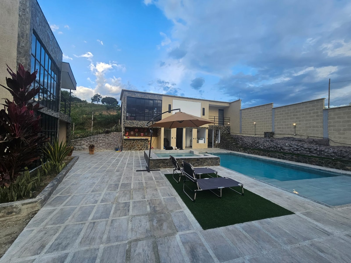 Country House in Pereira, Sector Cerritos, Easy Access. You will enjoy sunny days, tranquility, connection with Nature, and beautiful sunsets. Overlooking a spectacular guadual. Located 15 minutes from the International Matecaña Airport, with an excellent location to places of interest in the Coffee Region; 5 minutes from the best food malls in the city, supermarkets. Perfect place to enjoy with the family. With heated Jacuzzi, BBQ area, wood oven for pizza. Campfire area. Pet Friendly.