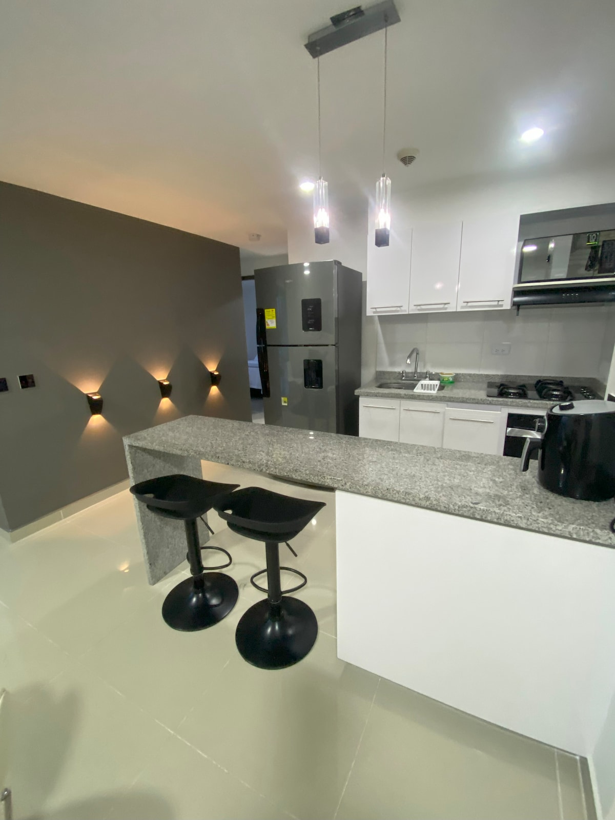 Lujosa suite ,ubicada al frente del aeropuerto y enseguida el centro comercial unicentro, amoblada con todo lo necesario para disfrutar tu estadía, Ac, parqueadero, cocina dotada, agua caliente, Wifi… Con espacio para coworking , con máquina dispensadora de bebidas y alimentos , máquina de café y bebidas calientes y una sala de muy buen espacio para tus reuniones de trabajo
