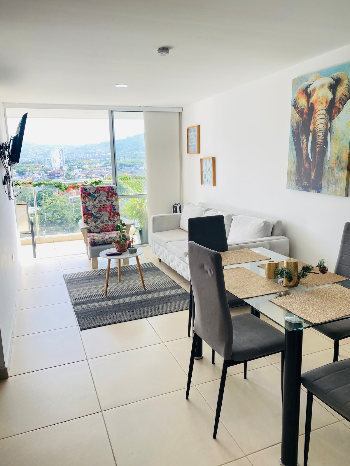 Relax and enjoy a comfortable and modern space. Watch your favorite movies or series on a 4K TV without leaving the bed. Share a glass of wine on the balcony while admiring a beautiful view of Pereira. You’ll be just steps from Circunvalar, surrounded by restaurants, cafés, and bars. Explore the Coffee Region with our guidance. The building offers a pool, washer, dryer, and an ideal location close to Megacentro Pinares.