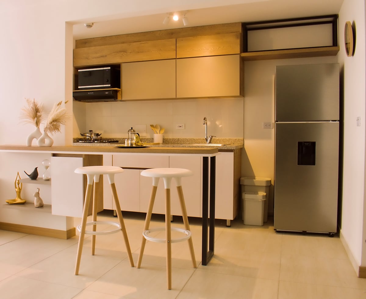Disfruta de una experiencia sin igual en este hermoso y moderno apartamento, que cuenta con: Conjunto cerrado vigilancia 24 horas Parqueadero moto y carro Piscina y juegos niños Ascensor 2 habitaciones 2 baños completos 2 TV smart 2 aires acondicionados Cocina dotada con todo horno y freidora aire Lavadora y nevera Tendedero de ropas Sala y barra comedor