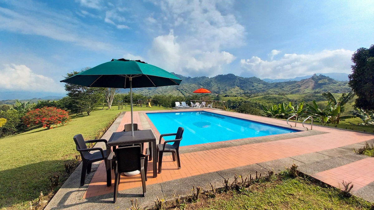 Spectacular entire coffee farm - country house in Quindio, approximate 20 minutes from Finlandia, large green areas, kiosk, swimming pool, tv, wifi, surrounded by coffee plants, true experience of a coffee farm, transportation available, the home is ideal to enjoy with family and friends, enjoy the view while drinking a Colombian coffee in the morning. Please see the description of the road. Please keep in mind that this is a farm and there is a worker attending the farm, the guess area separate