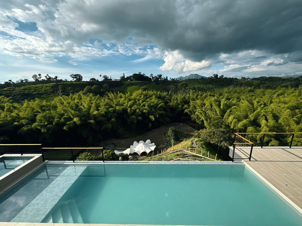 Immerse yourself in an exclusive and deeply sensorial experience at Casa Río, a modern villa suspended above the mountain, where design and nature intertwine seamlessly. A prime location in the center of the Coffee Region. - 22 minutes to the International Airport - 20 minutes to Expofuturo - 22 minutes to Ukumari - 25 minutes to Cerritos del Mar Mall - 44-57 minutes to Finlandia/Salento-Valle del Cocora - 55 minutes to Panaca - 1 hour to the Coffee Park