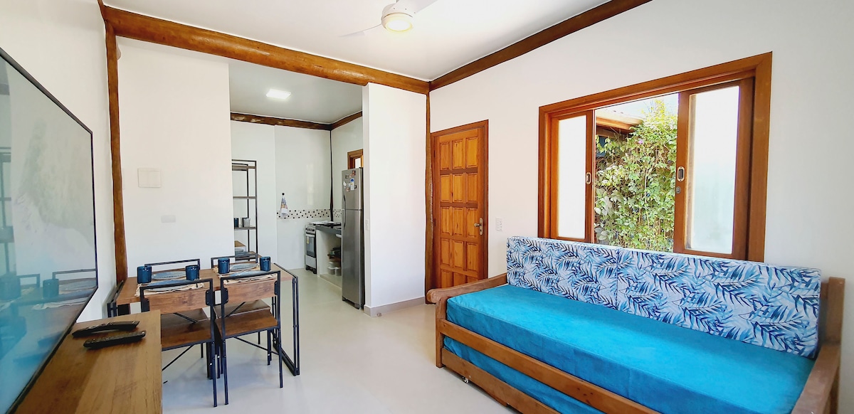 Charmoso e aconchegante flat em condomínio fechado a 100mts da praia de Maresias no Canto do Moreira, lado privilegiado. Estamos à 2km do centro comercial. Acomoda confortavelmente até 4 pessoas. Ar condicionado no quarto e na sala. Wi-Fi e TV a Cabo. Importante: Estar ciente e de acordo com as regras antes de finalizar a reserva.