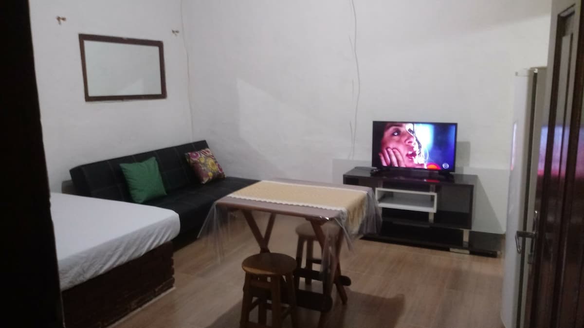 Kit super charmosa e muito bem localizada próximo (400 m) da praia do Itaquanduba e Itaguassu. Próximo a vários restaurantes, mercado e ao centro comercial (pereque) Acomoda até 3 pessoas, sendo um quarto com cama de casal tamanho queen e uma sala com cama e bicama. Tv smart Tem estacionamento em vaga descoberta e mercadinho na porta de casa. Local estratégico!