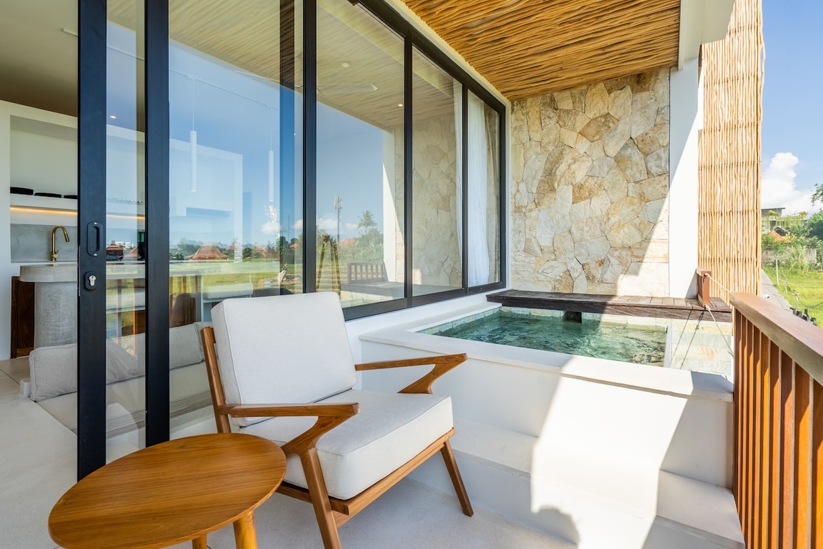 Stay in a modern Japandi-style [1] studio apartment [size: 28m2] with direct pool access in the heart of Pererenan. Thoughtfully designed for work and relaxation, this cozy space features an ensuite bathroom, kitchenette, sofa, and smart TV. Work remotely in the shared co-working space with ergonomic desks, monitors & meeting rooms, then enjoy the rooftop terrace & 12m pool. Walk to top cafés, gyms, and the beach. Daily housekeeping included!