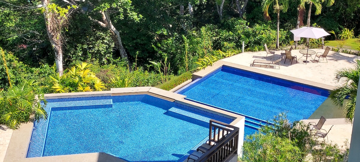 2-bedroom condo with beautiful views, perfect for a relaxing stay. The condo offers a master bedroom with ocean views and a second bedroom, both with Queen beds and en-suite bathrooms for privacy. Enjoy serene mornings and sunsets from the balcony, with tropical surroundings. The property includes a large, well-maintained pool for refreshing swims. Lush vegetation and local wildlife, like monkeys and toucans, enhance the peaceful atmosphere. A perfect mix of comfort and nature for your getaway!