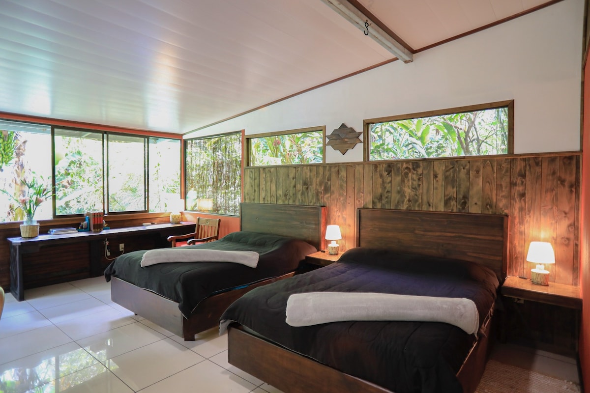 Located on the top floor, The Exotic Jungle View Suite features, well...epic JUNGLE! Beds are two twins that can be separated for friends or put together for a full King comfort You will fall asleep to the sounds of the jungle and awake to singing birds. *Monkey sounds included. ;)
