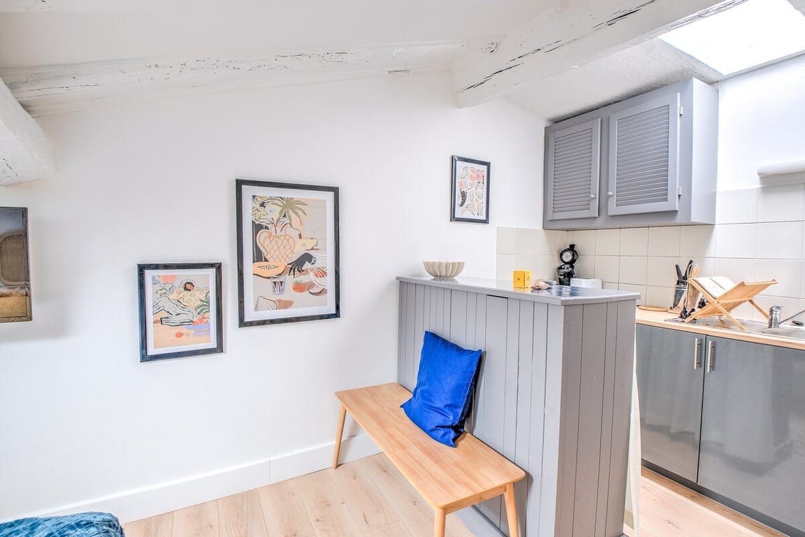 Charmant T2 situé dans le coeur historique de Périgueux, à 100 mètres de la cathédrale. D'une trentaine de mètres carrés, il est composé d'un salon-cuisine, une salle d'eau avec une grande douche, et une chambre avec un lit 140 de très bonne qualité et en face un coin dressing (dressing, coiffeuse/bureau, miroir). La cuisine est bien équipée (plaques vitrocéramiques, four, micro onde, cafetière, bouilloire, toasteur, ustensiles). Accès WiFi, TV.